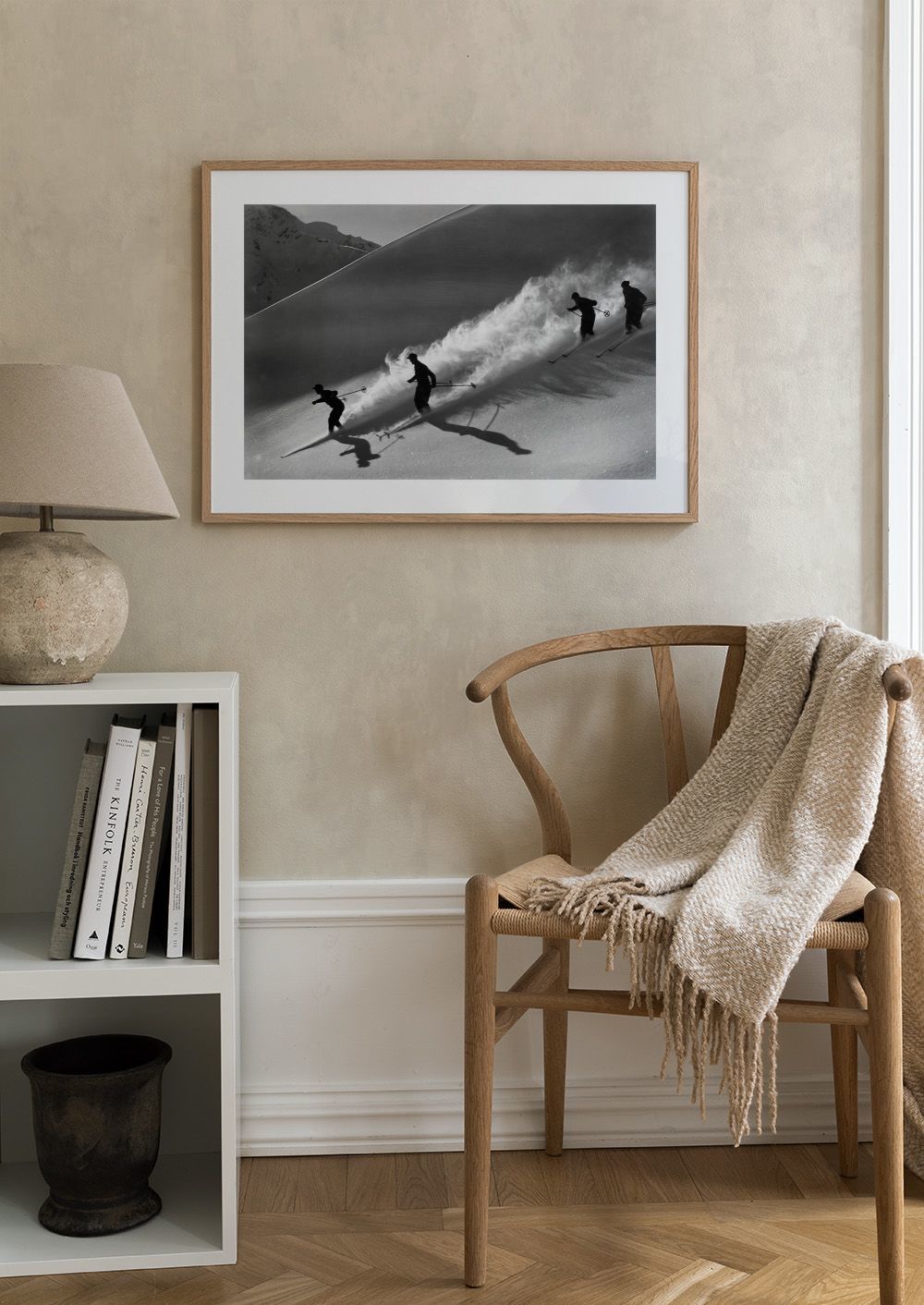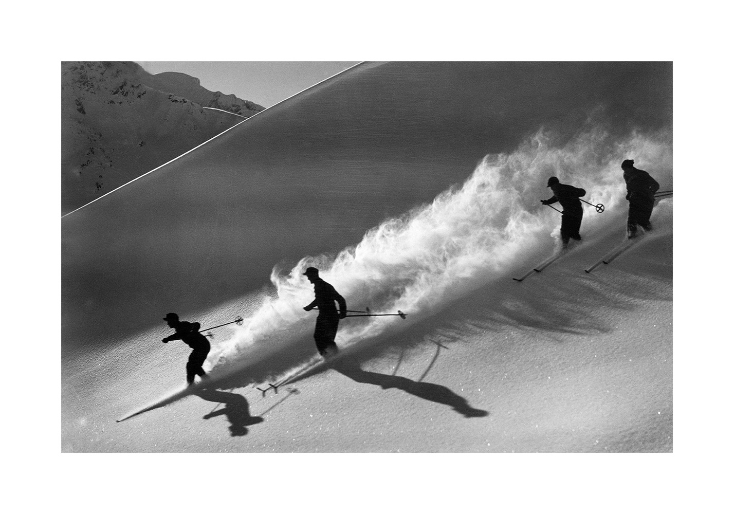 Black and white poster of four skiers moving downhill on a snowy slope with mountain views in the background.