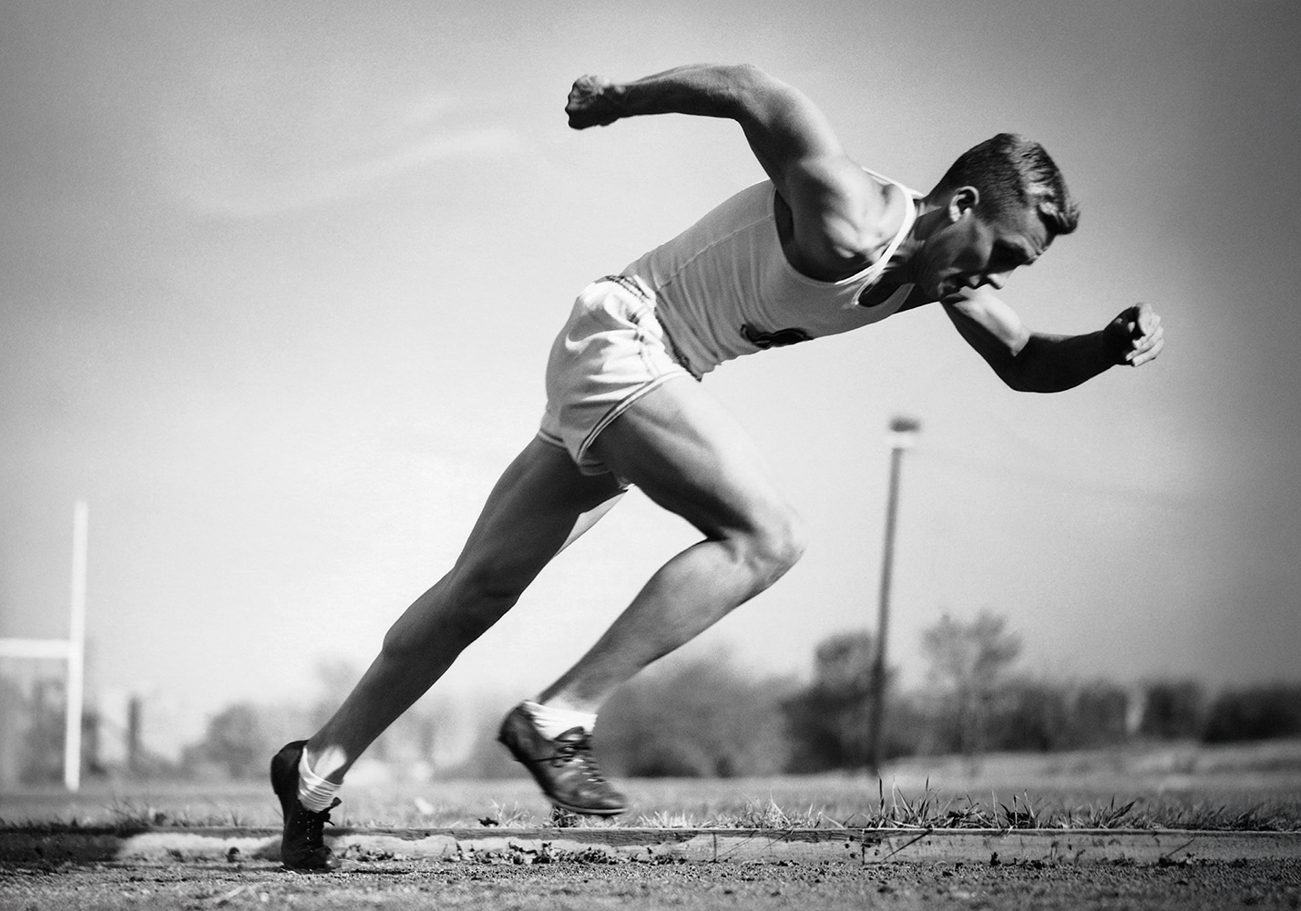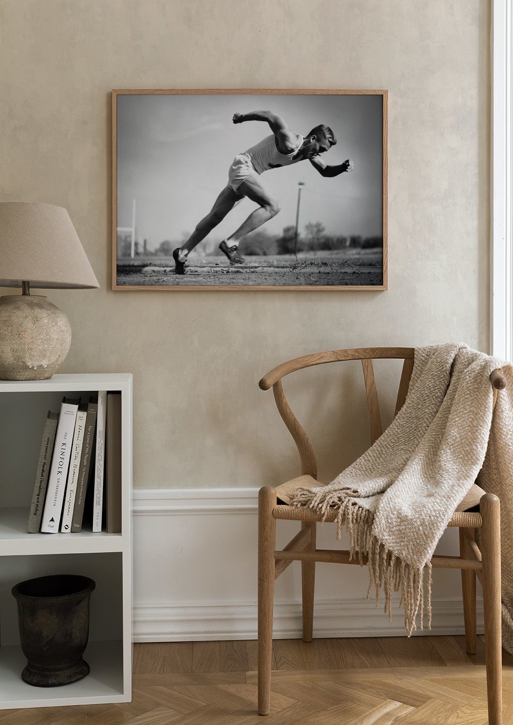 From $31Black and white poster of a person running on a track, wearing a sleeveless shirt and shorts. Dynamic print capturing motion with trees in the background.