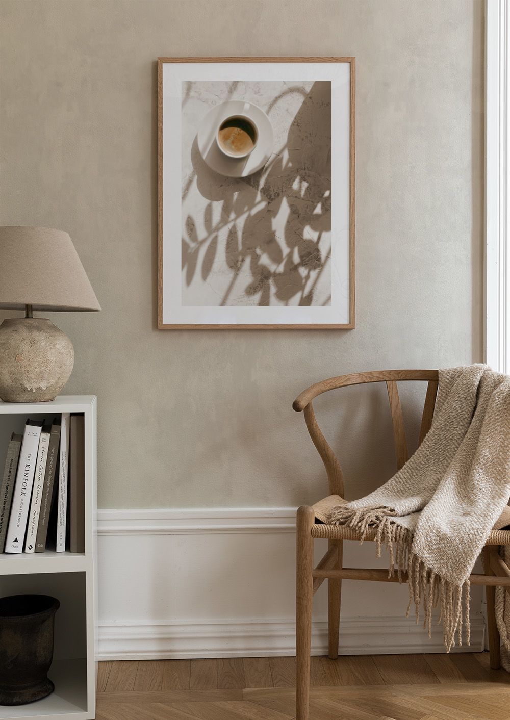 Un póster de una taza de café con espuma cremosa sobre un plato blanco. Las sombras suaves de hojas crean un patrón hermoso sobre la superficie con la cálida luz del sol.