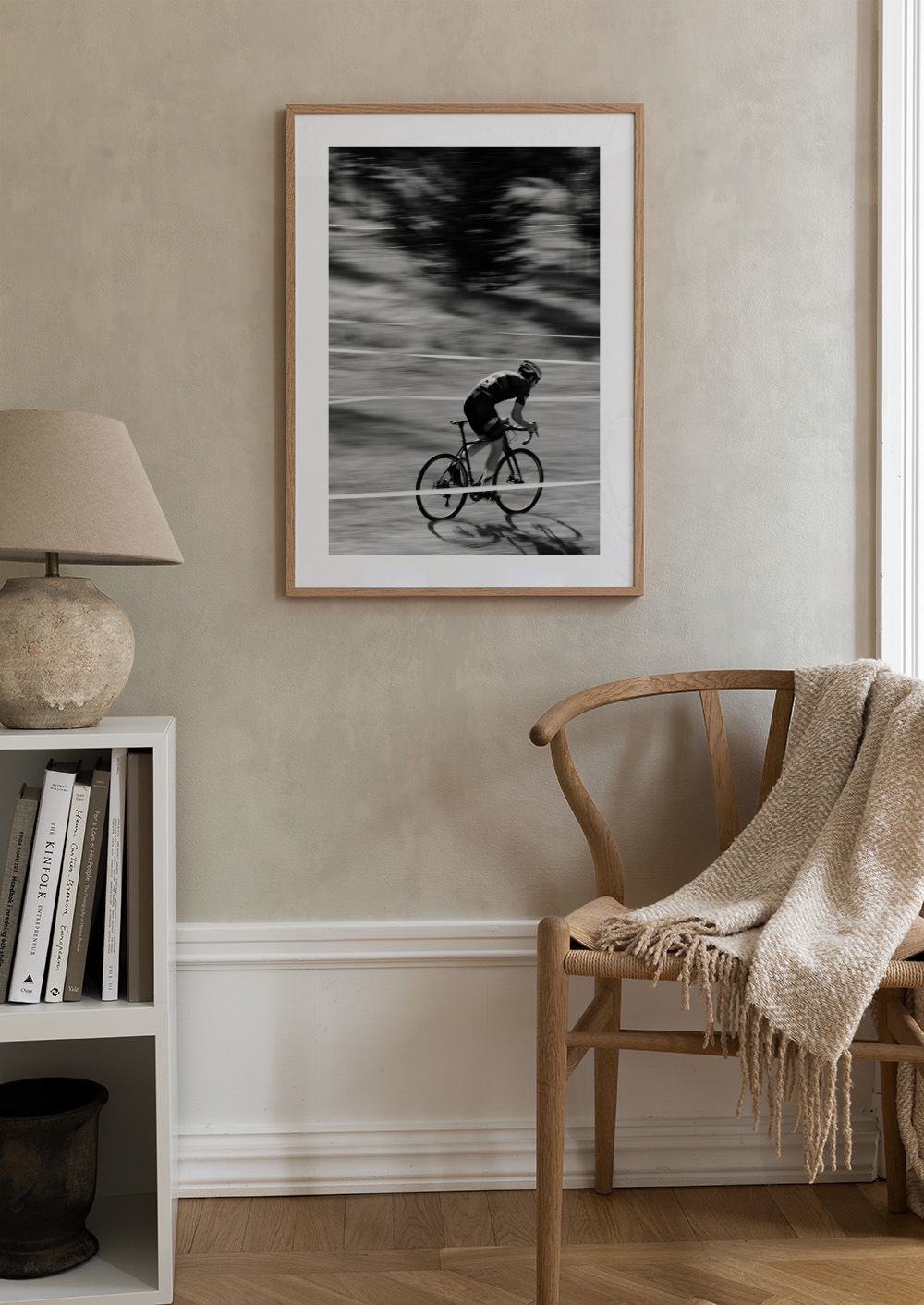 Una fotografía en blanco y negro de un ciclista en plena carrera. La imagen captura la velocidad y el movimiento con un fondo borroso y líneas diagonales.