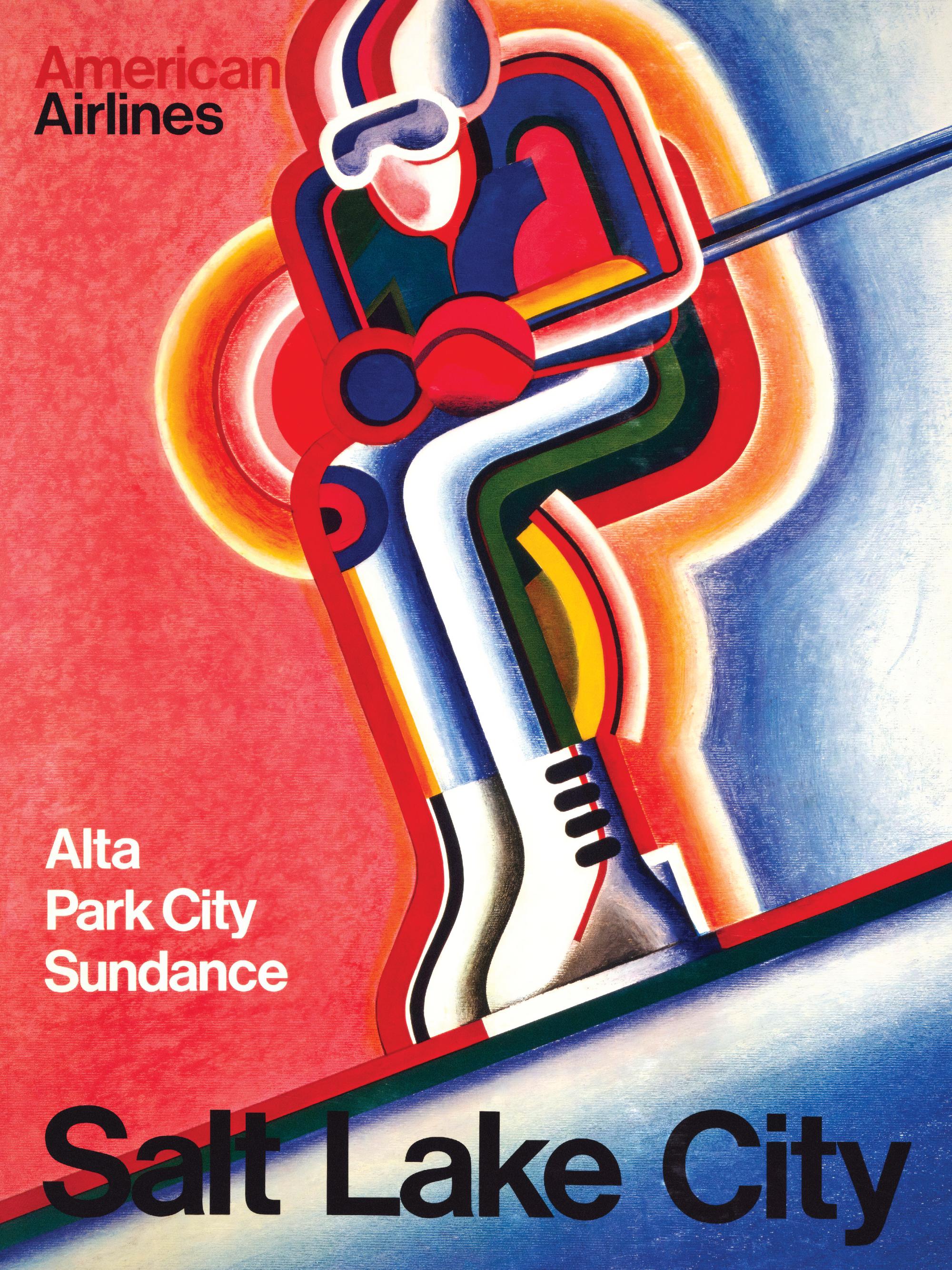 Un póster vintage con un esquiador en colores brillantes sobre un fondo rojo, azul y blanco. El diseño dinámico captura el movimiento del esquí con líneas curvas y energía.