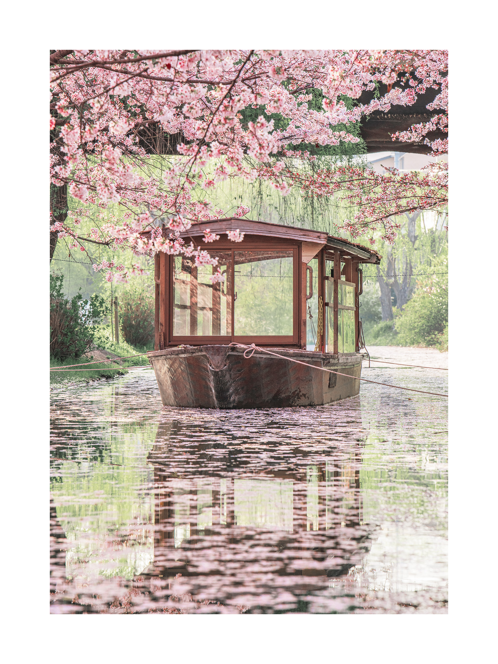 Desde $26.37Un póster de un bote de madera flotando en aguas tranquilas bajo cerezos en flor. Las flores rosadas se reflejan en el agua, creando una escena llena de paz y belleza natural.