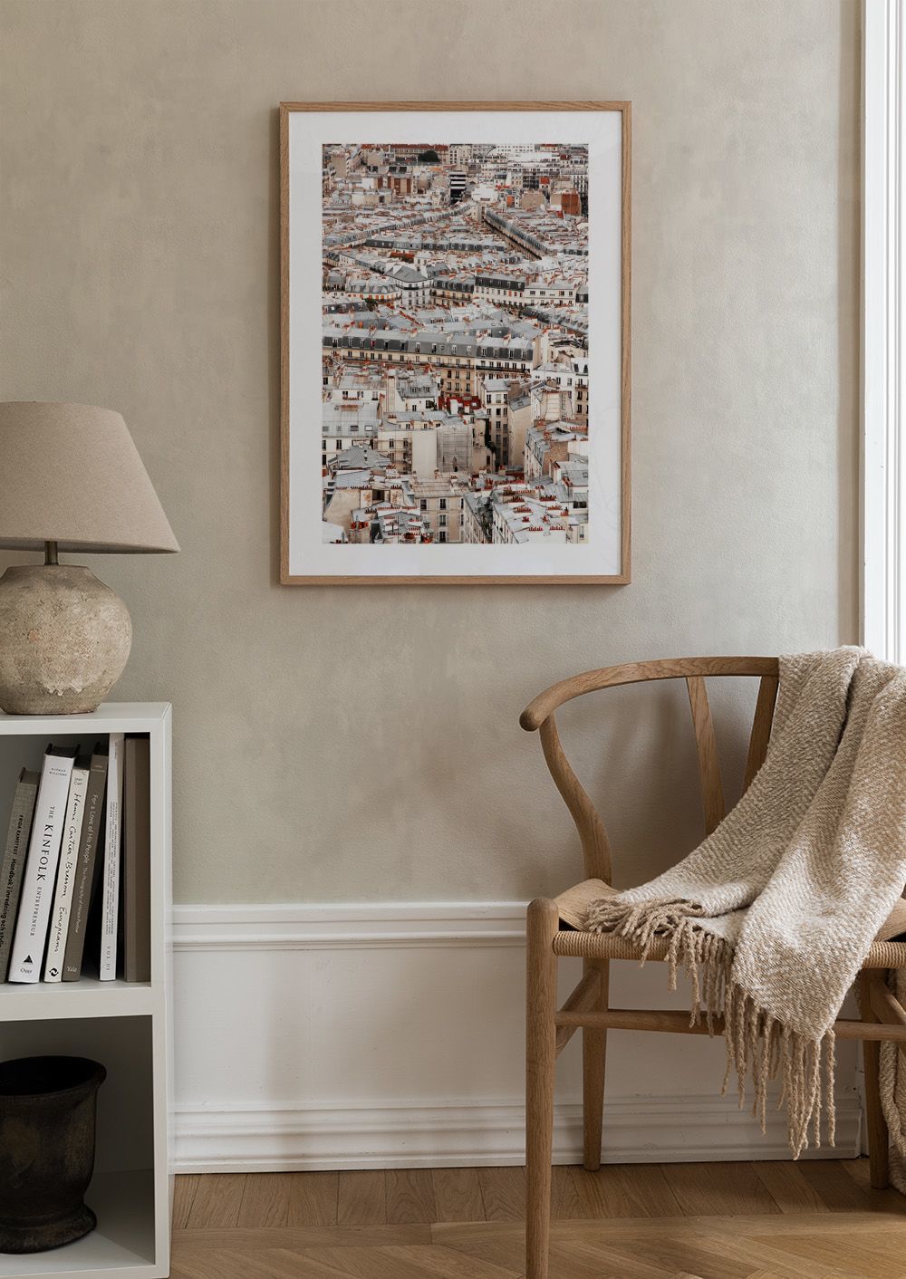 Una vista aérea de los tejados parisinos con edificios beige y chimeneas rojas. Un póster perfecto para darle un toque europeo a tu hogar.