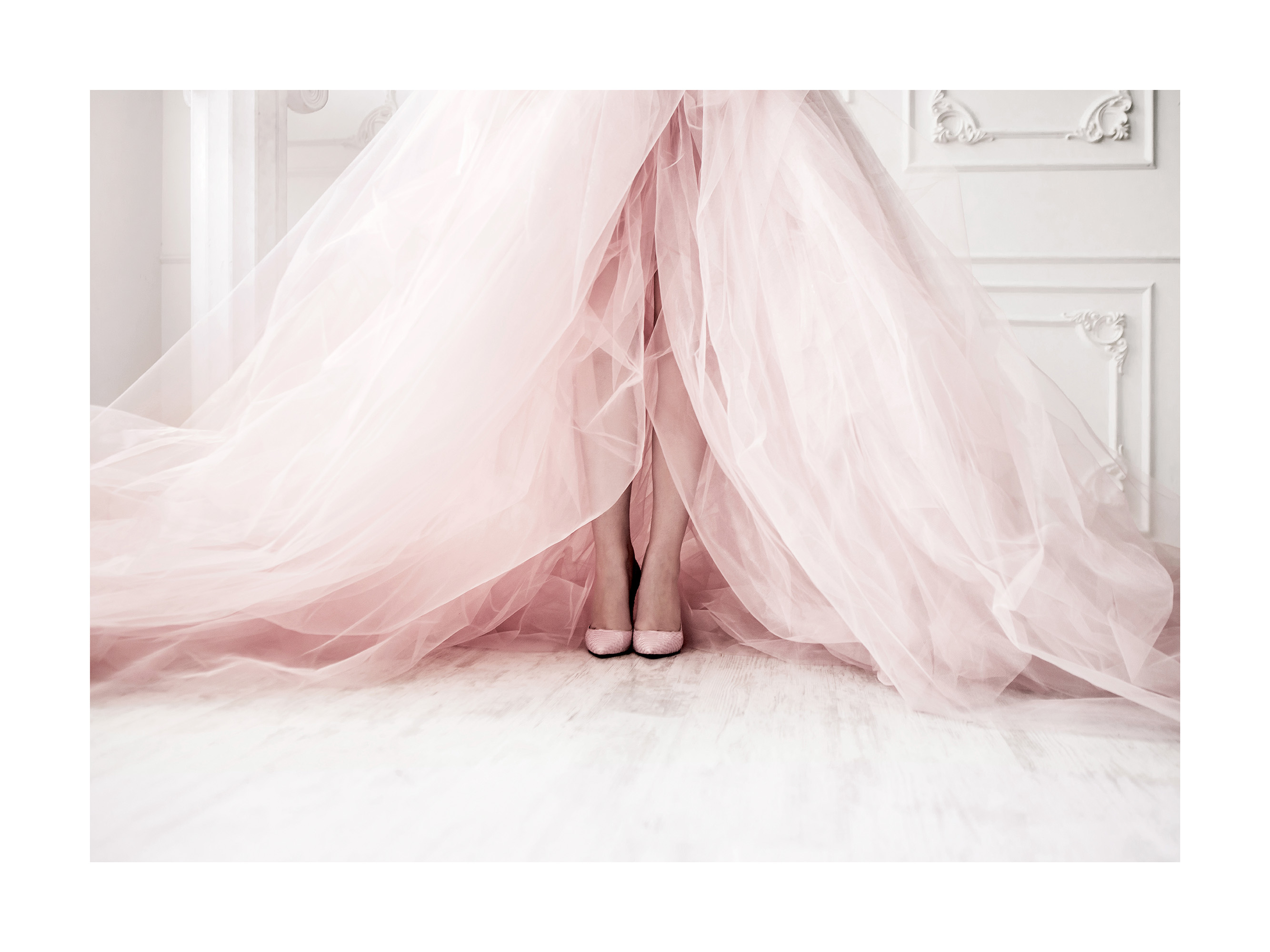 Elegante póster de una mujer con un impresionante vestido rosa y tacones altos frente a una puerta de madera blanca adornada. ¿Alguna vez has soñado con ser una princesa y usar un vestido tan hermoso? Las dimensiones del póster incluyen un passepartout incorporado.