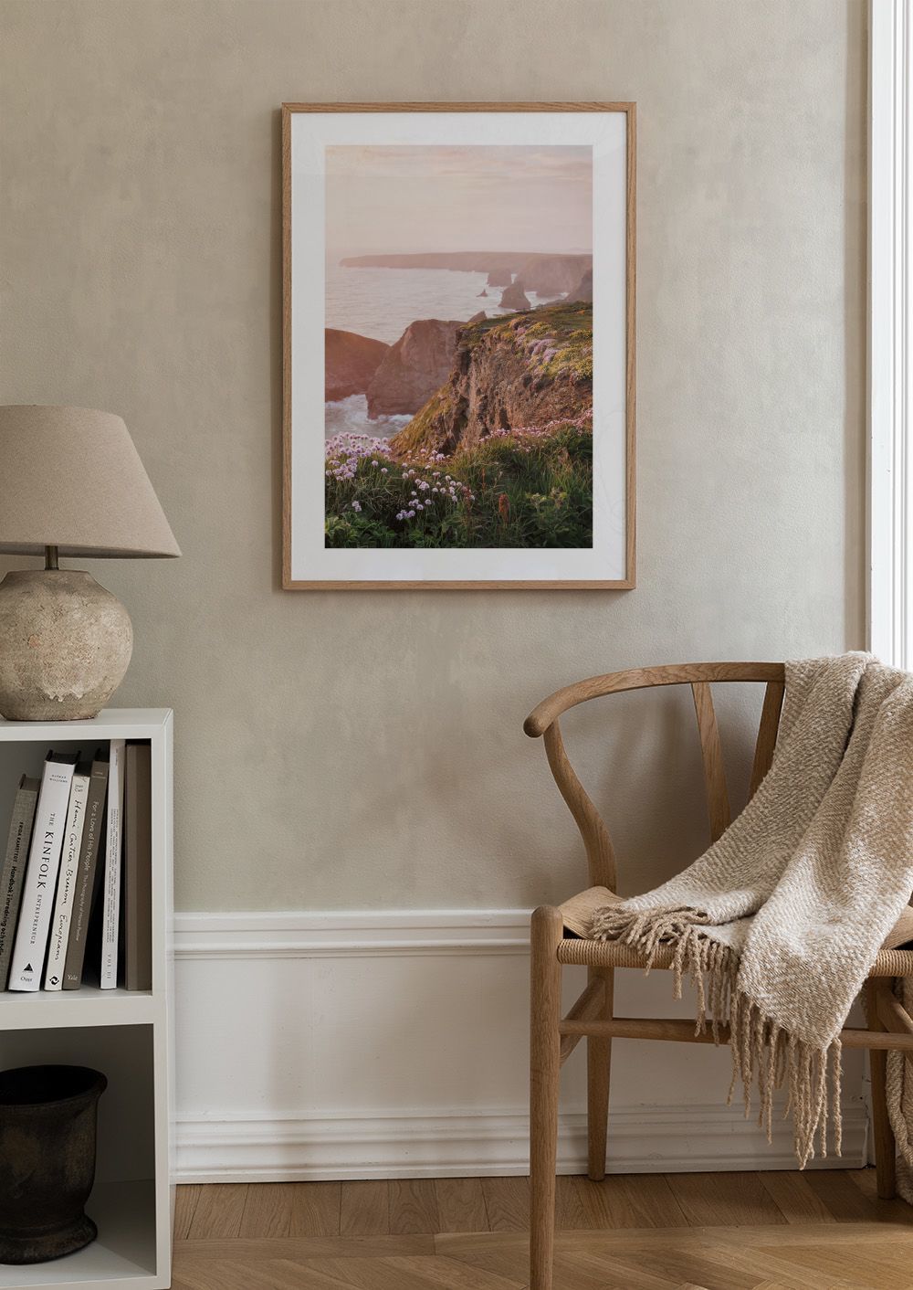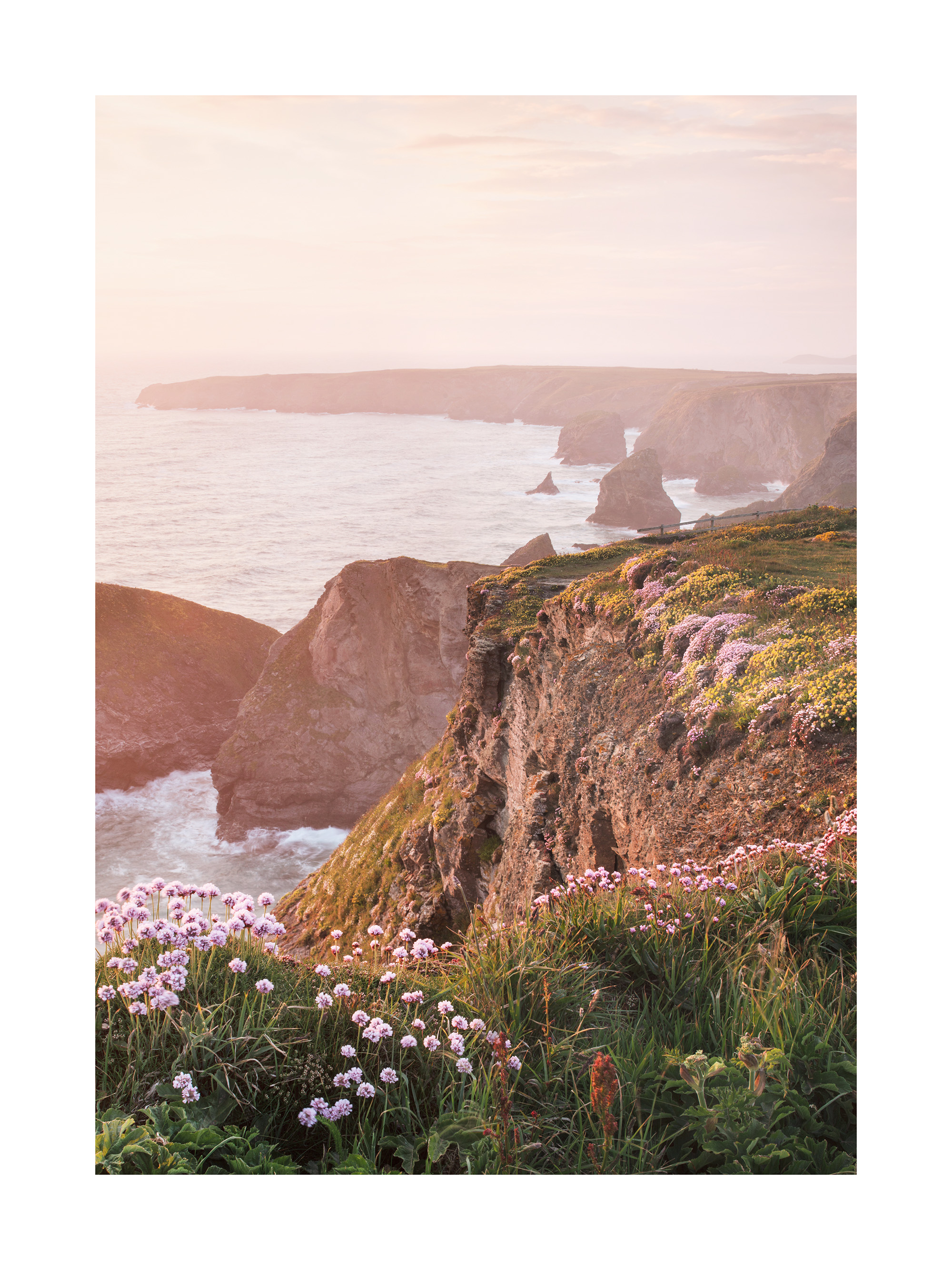 Desde $15.57Un póster de acantilados rocosos junto al océano con flores rosas y blancas. El cielo tiene tonos rosa y naranja que crean una atmósfera tranquila y serena.