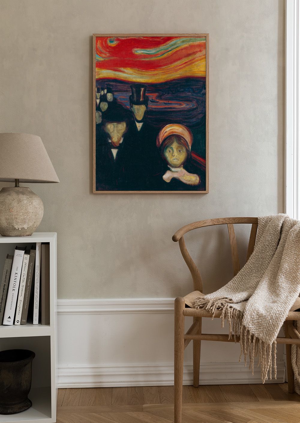 Un póster con tres figuras bajo un cielo intenso en tonos rojos, naranjas y amarillos. Las pinceladas texturizadas crean una atmósfera misteriosa y llena de emoción.
