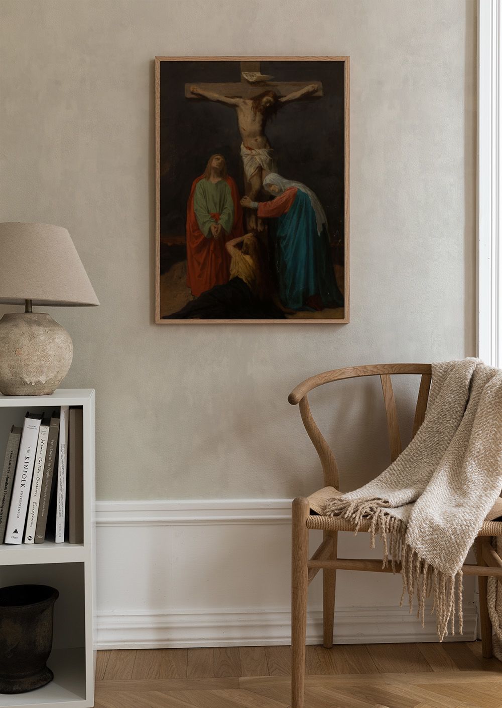 Desde $15.57Un póster que muestra a Jesús en la cruz con personas a sus pies. Los tonos rojos, azules y verdes contrastan con el fondo oscuro, creando una escena poderosa y emotiva.