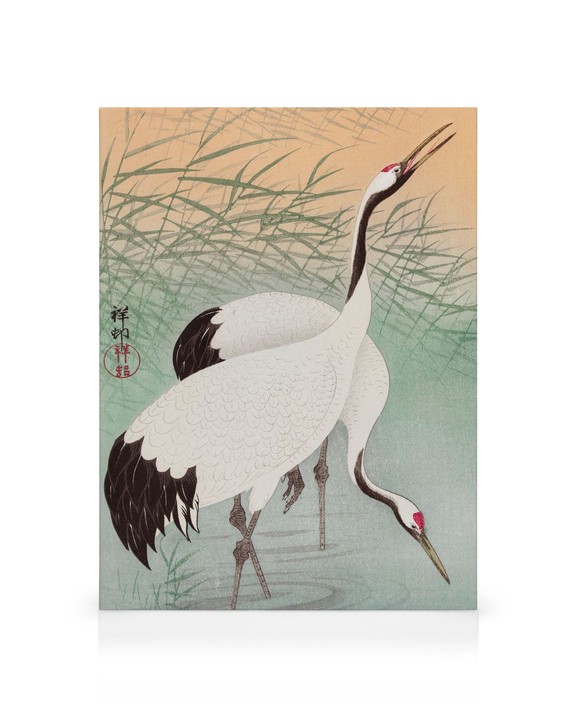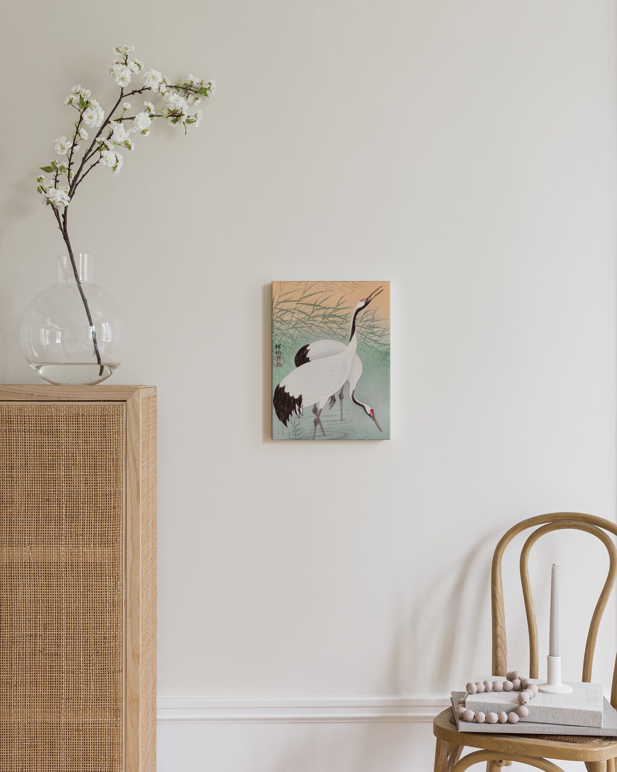 Two white cranes with red heads standing in calm water. A peaceful canvas print with green reeds and soft orange tones.