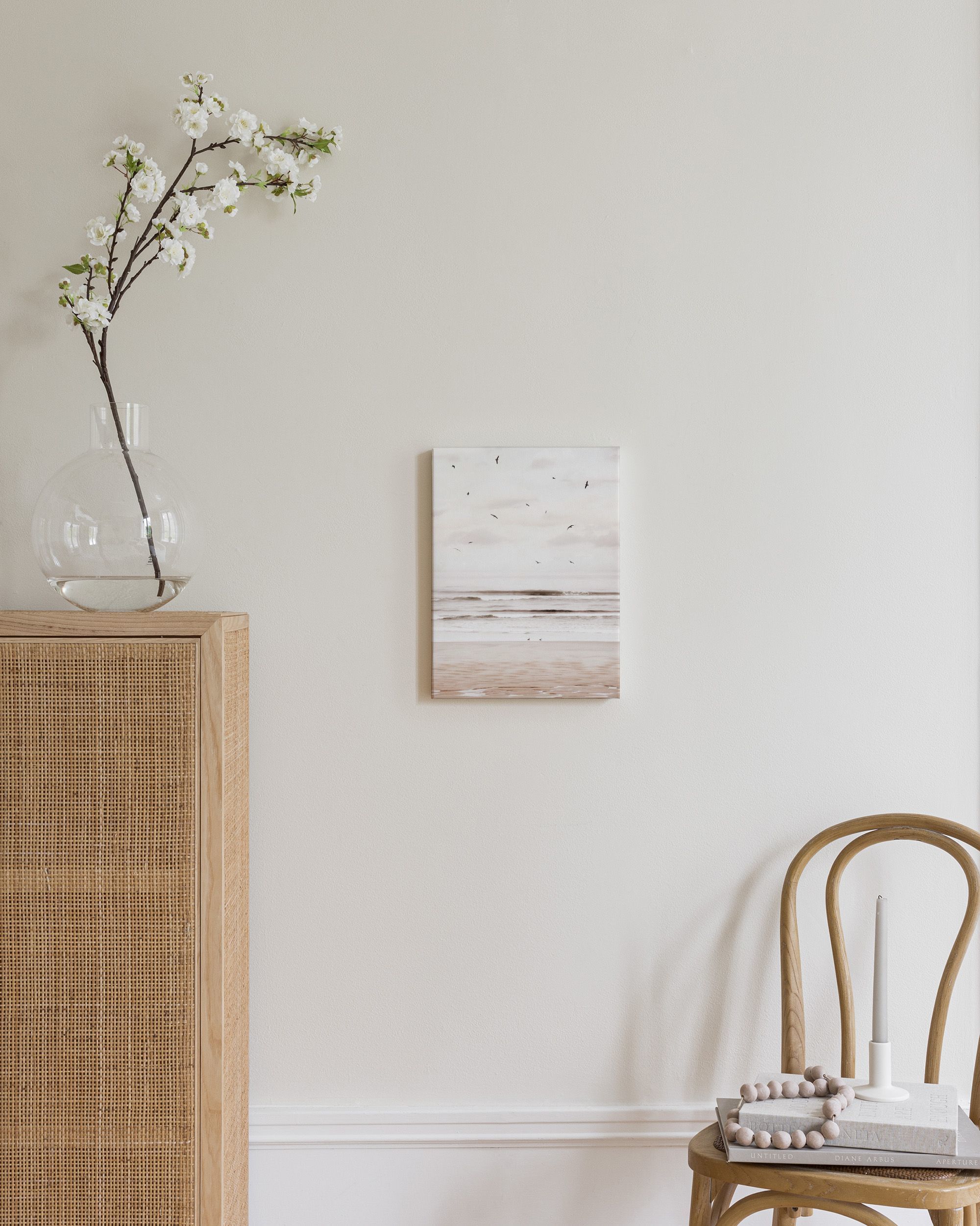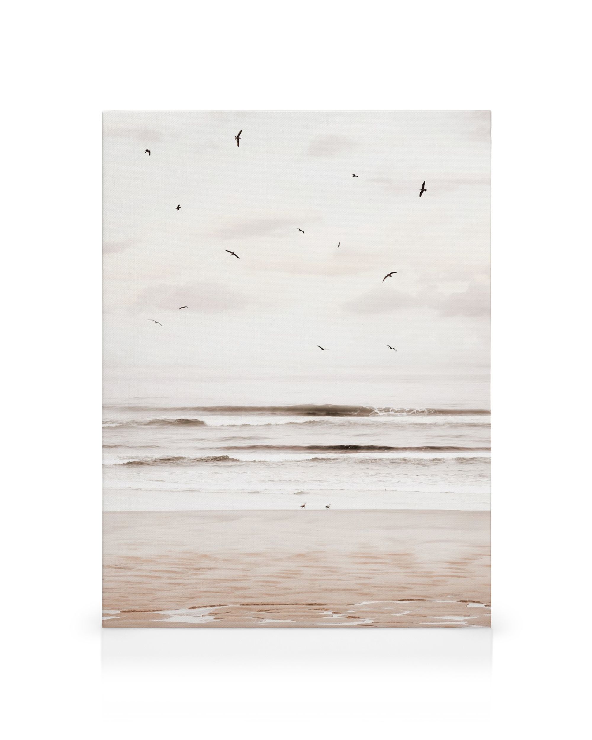 From $15.57A serene beach scene canvas print with a pale sky and ocean in soft white and brown hues. Capture the calm atmosphere and complete your gallery wall with this stunning piece.