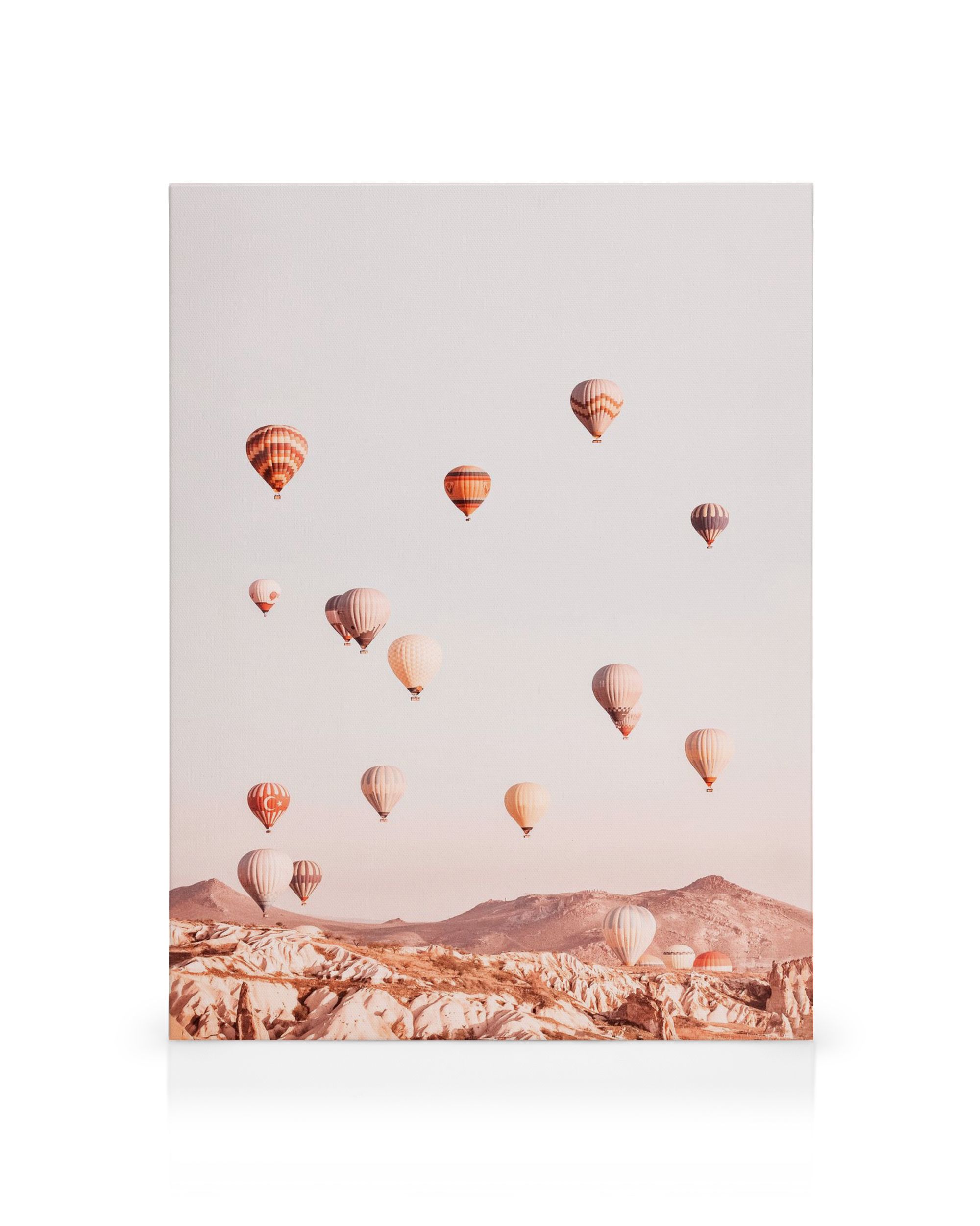 Beautiful canvas print showing hot air balloons above mountains at sunset. Perfect wall art for your living room or bedroom.