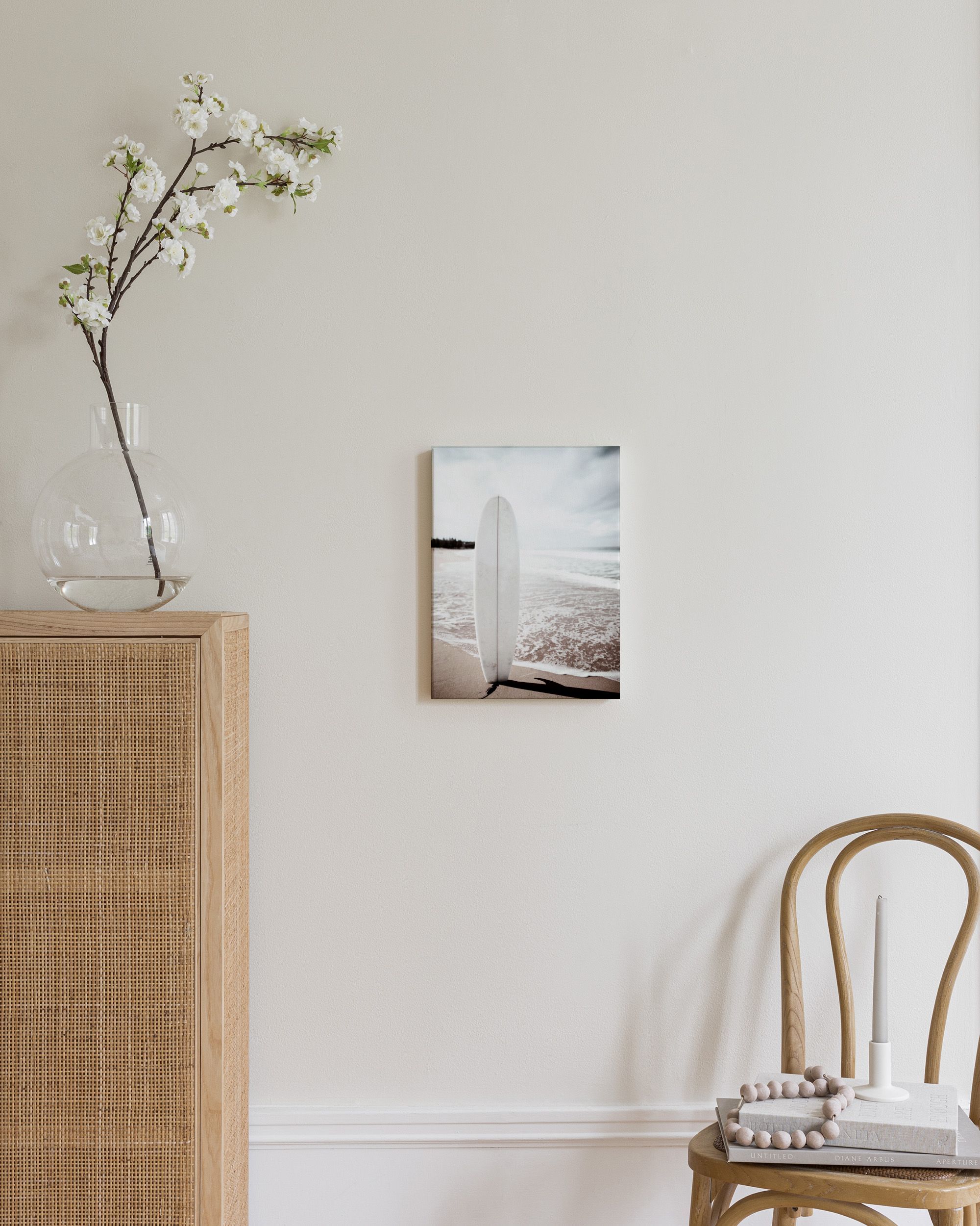 From $19.98Serene canvas print depicting a surfboard on a sandy beach, with gentle waves and palm trees in the distance. Perfect for creating a gallery wall with a tranquil, coastal feel.