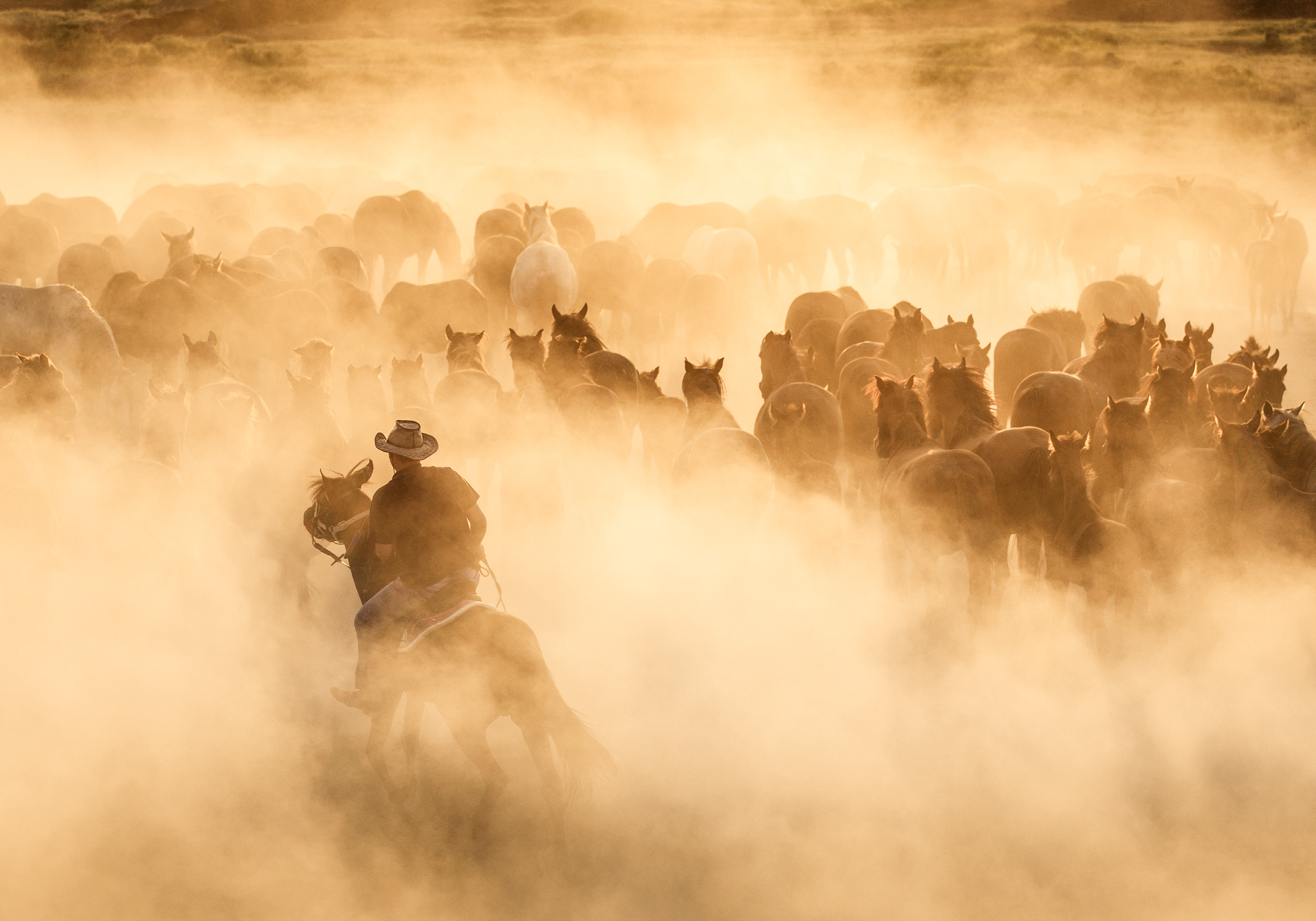 A print of a cowboy on horseback surrounded by a herd of horses in warm, golden light with a dusty atmosphere.