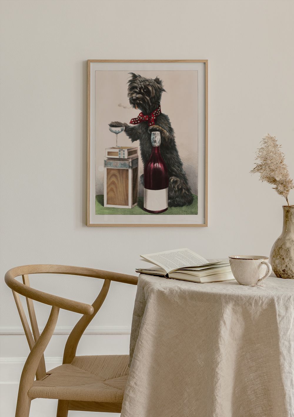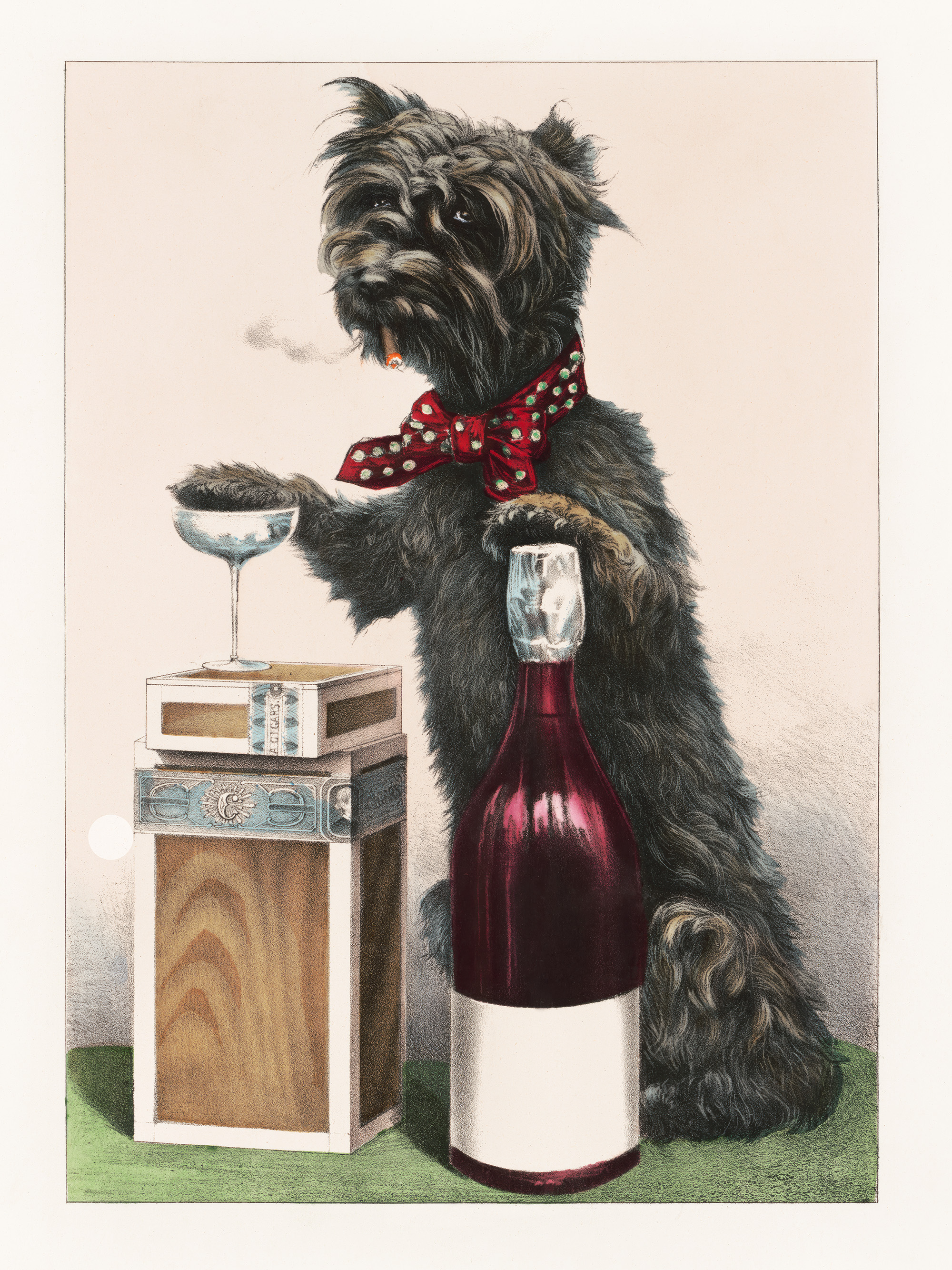 A print of a fluffy black dog standing upright with a red polka-dot bow tie, holding a cigar and a glass. A playful wall art piece!