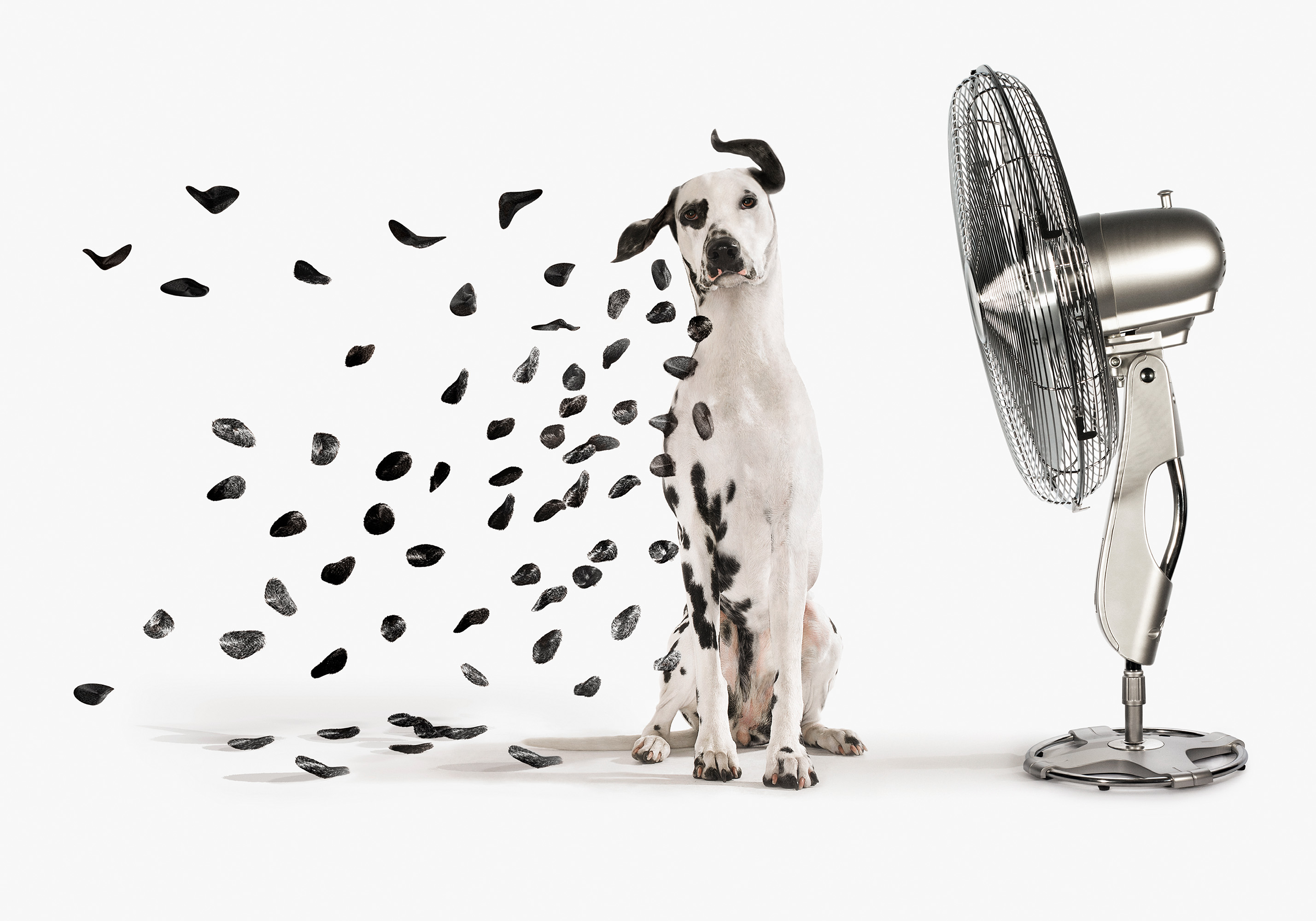 A playful print of a Dalmatian sitting next to a fan, with its black spots floating in the air. Fun wall art with a creative twist!