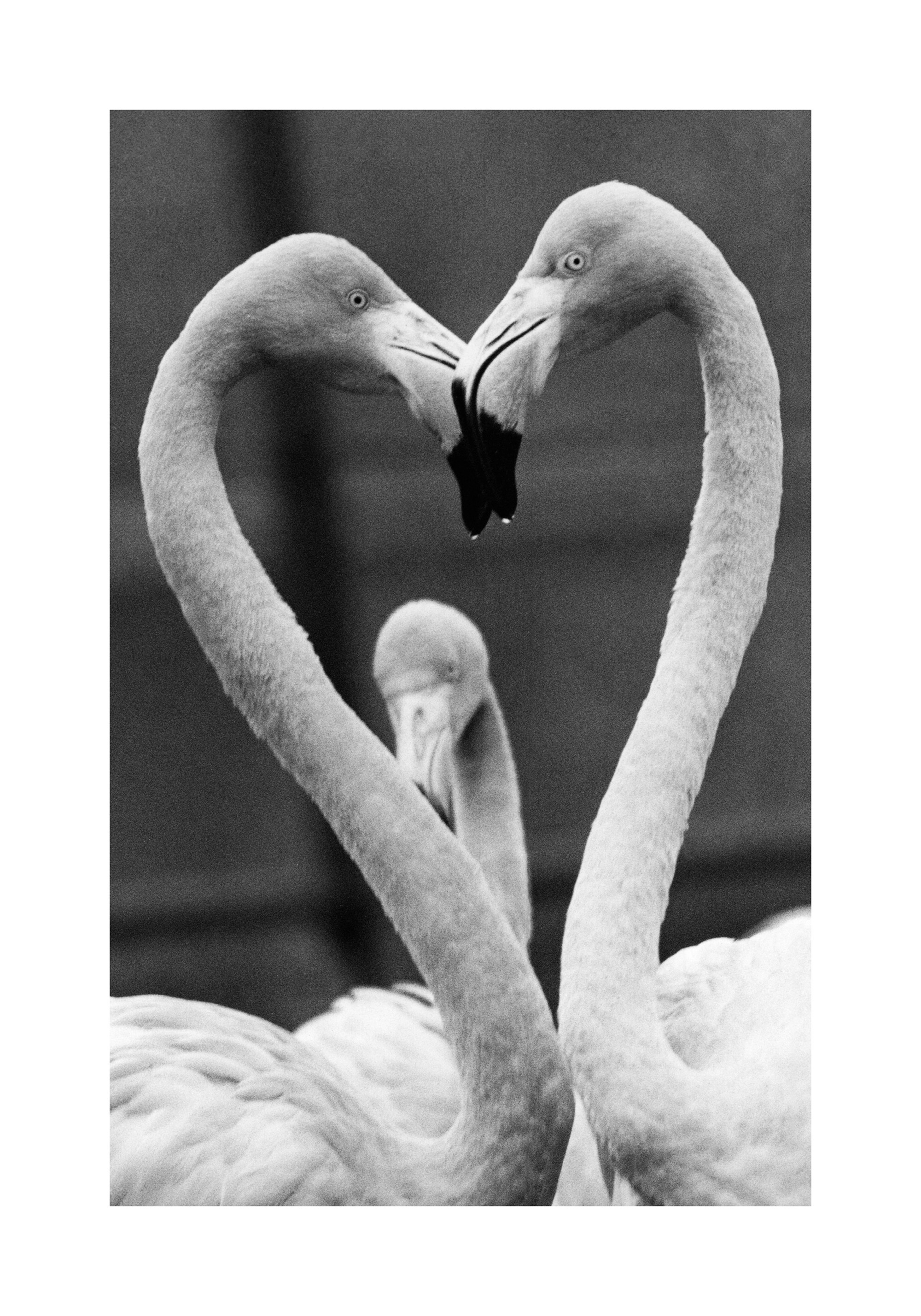 A black and white print of two flamingos forming a heart shape with their necks. Perfect wall art for your home!