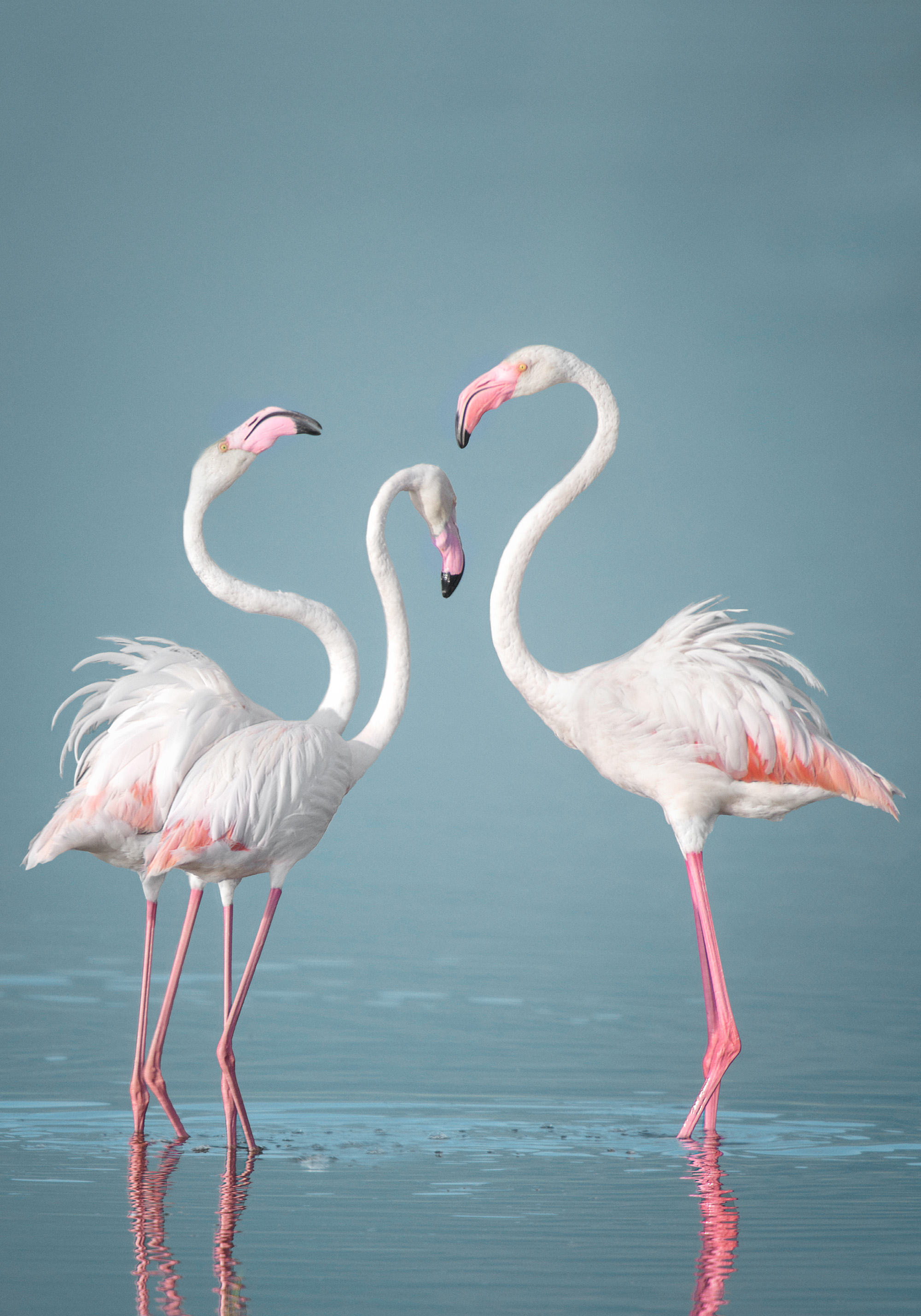 A print of three Japanese cranes standing in shallow water. The cranes have white and light pink feathers and the background is a soft pale blue colour.