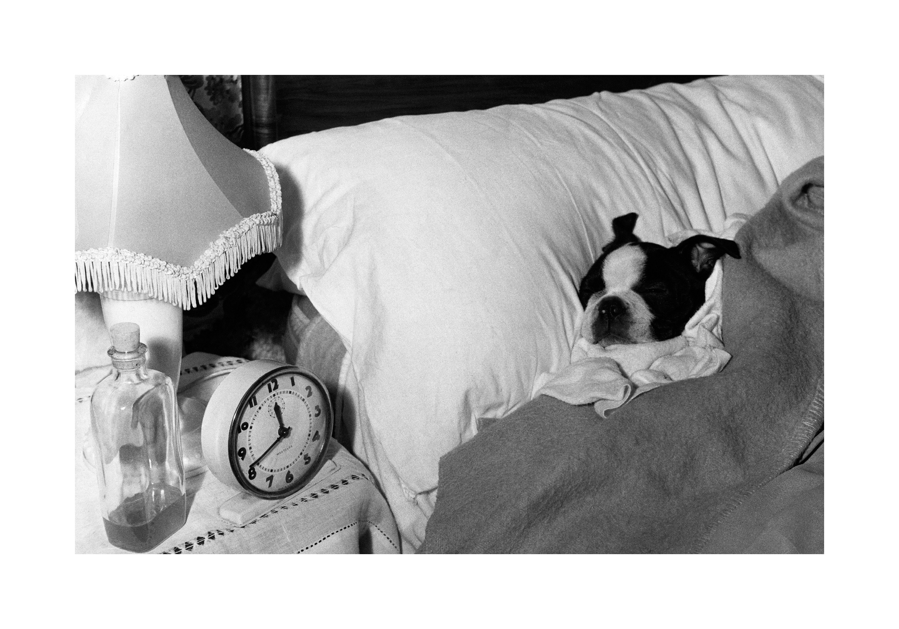 A cute black and white print of a small dog tucked into bed, resting on a pillow. Perfect wall art for dog lovers!