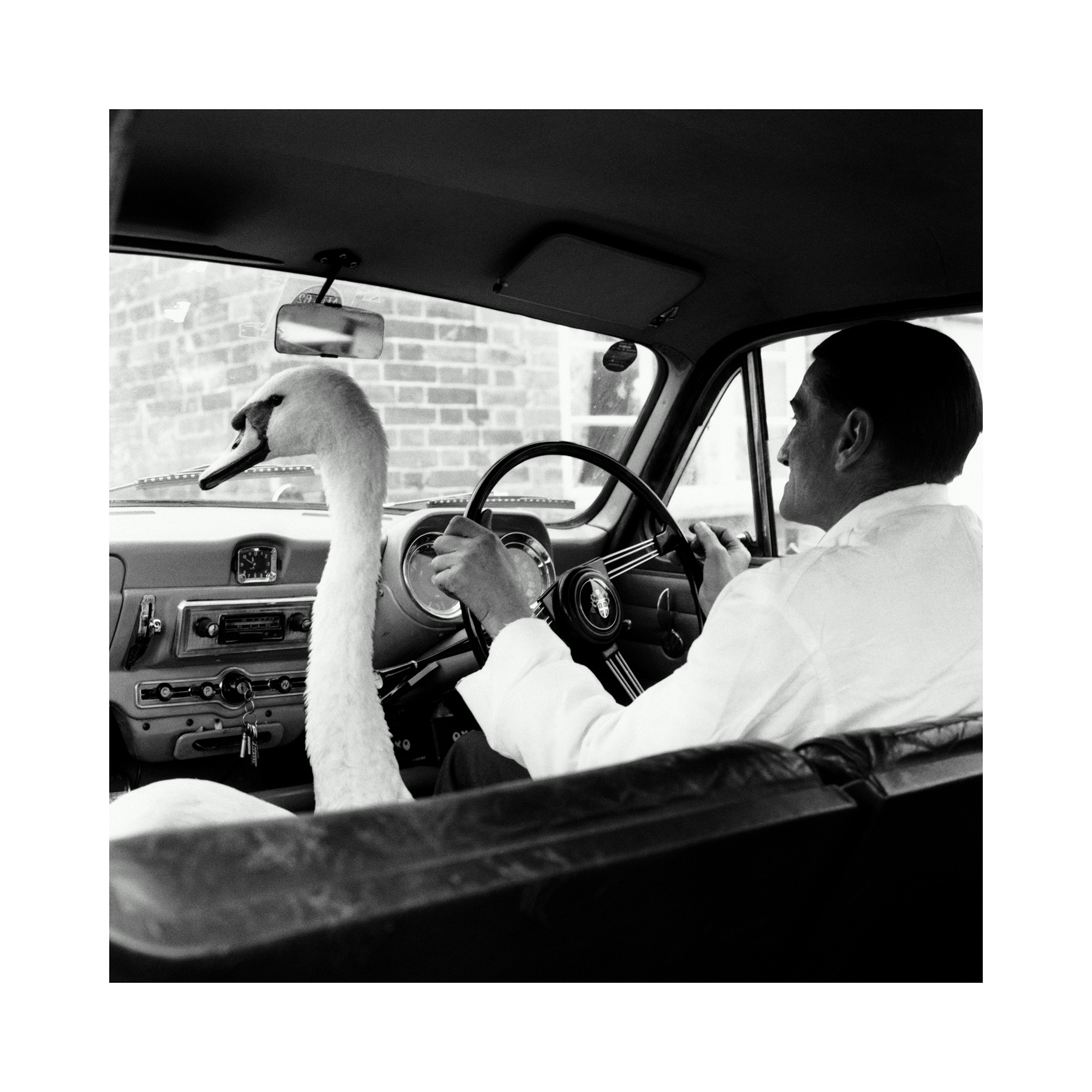 A funny black and white print of a swan sitting in the passenger seat of a classic car.
