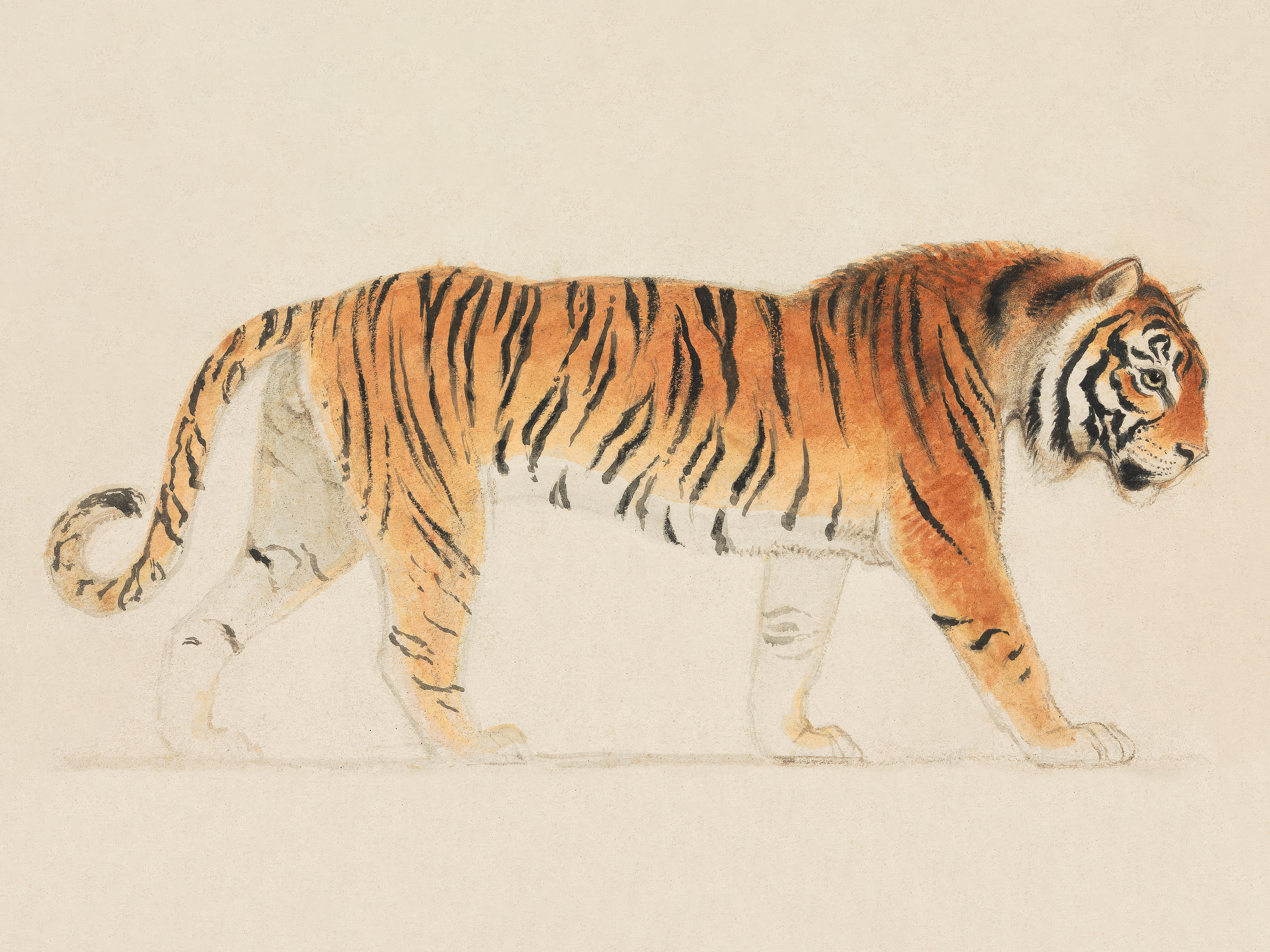 From $15.57A print of a tiger walking to the right with orange fur, black stripes, and a white belly. The detailed illustration shows the tiger's face, curled tail, and strong legs against a plain beige background.
