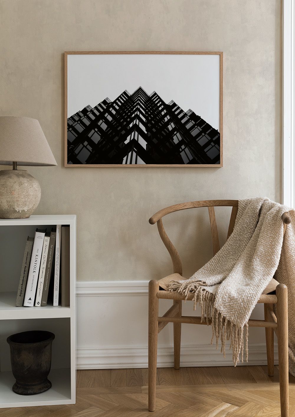 A striking black and white print of a modern building with glass windows, photographed from below. The sharp lines and geometric shapes create a dramatic look, perfect for adding a bold touch to your wall art collection.