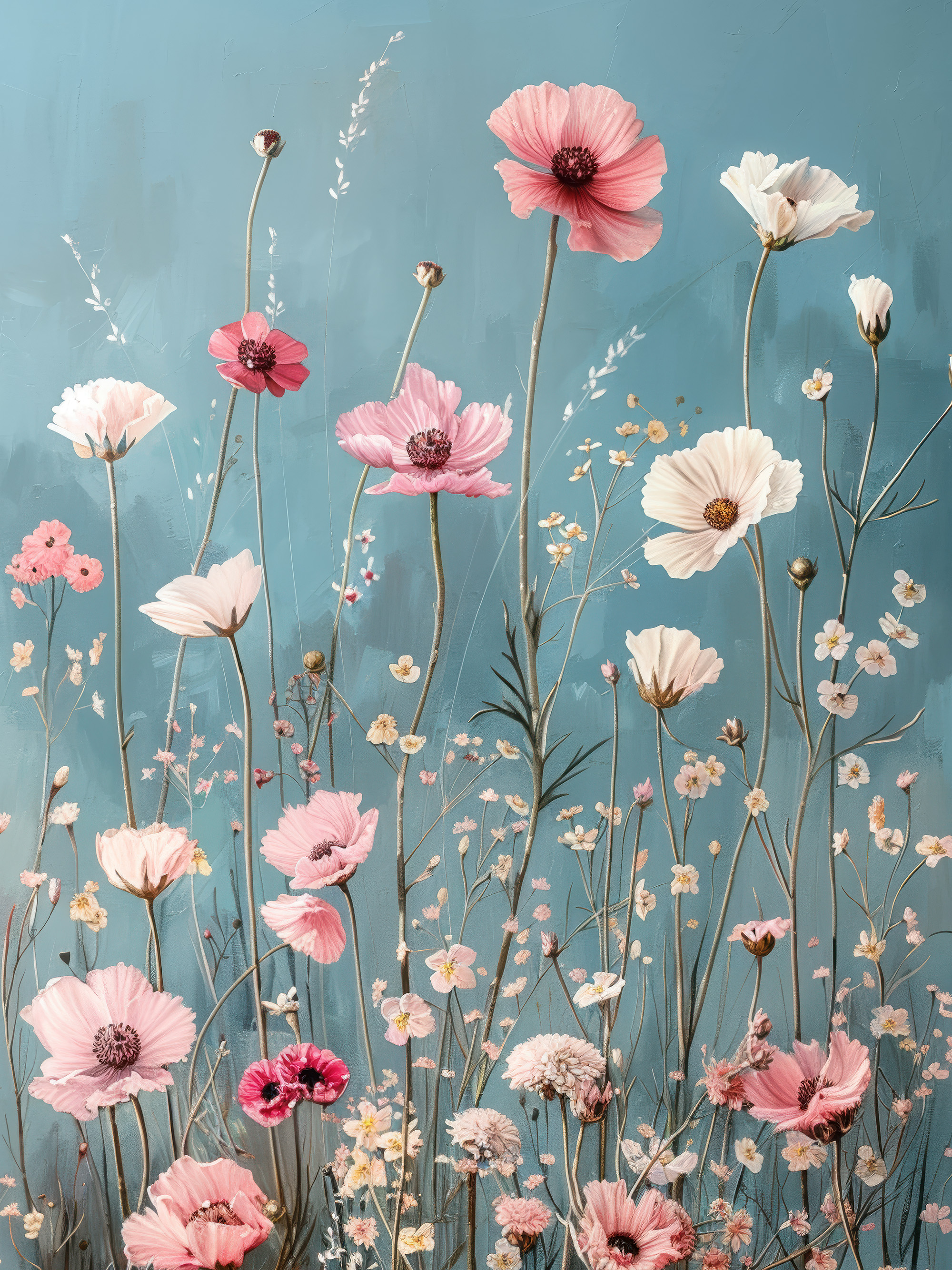 From $15.57A print of tall pink and white wildflowers with thin green stems against a light blue background. Perfect wall art to bring a calm and gentle feeling to your home.