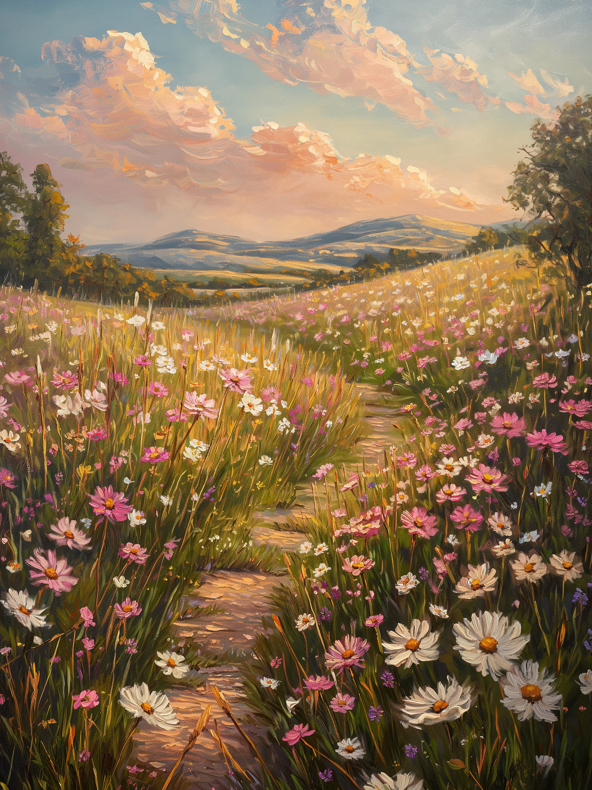 From $15.57A print of a path winding through a wildflower meadow with pink, white, and purple flowers amongst green grass under a blue sky with fluffy clouds.