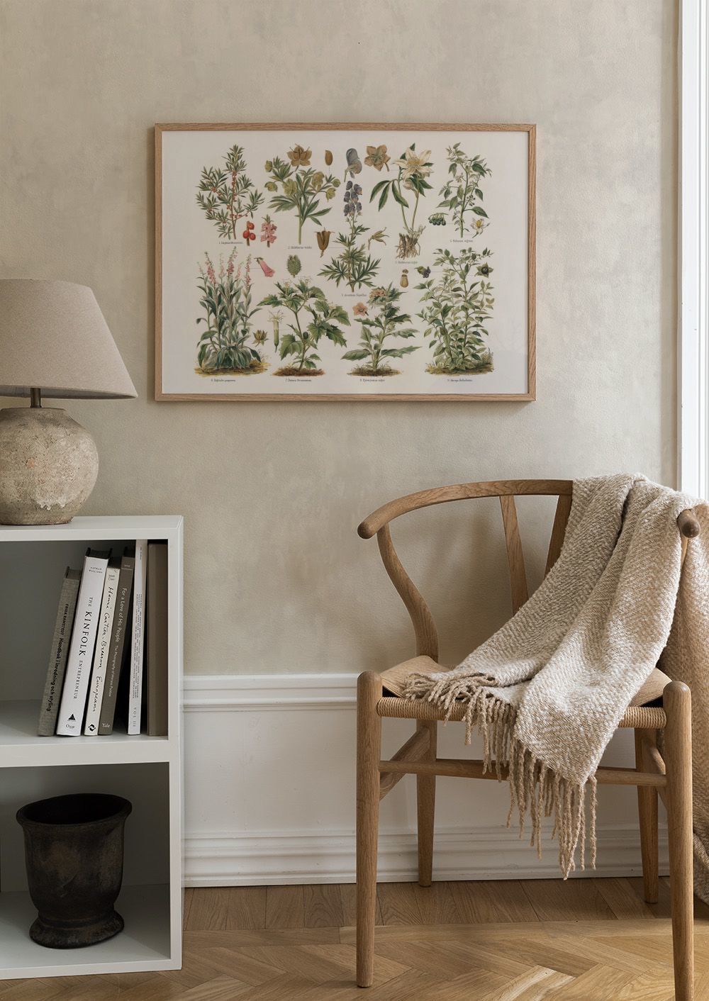 A print featuring nine detailed botanical illustrations of different plants with green leaves, red berries, and purple and white flowers on a light background.
