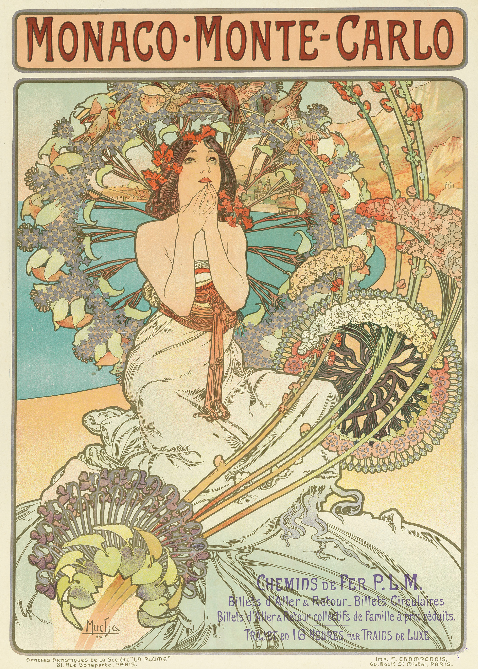 From $15.57A beautiful print of a woman with long brown hair and a red flower crown, surrounded by colourful flowers and plants. Art Nouveau poster with soft pastel colours and intricate details.