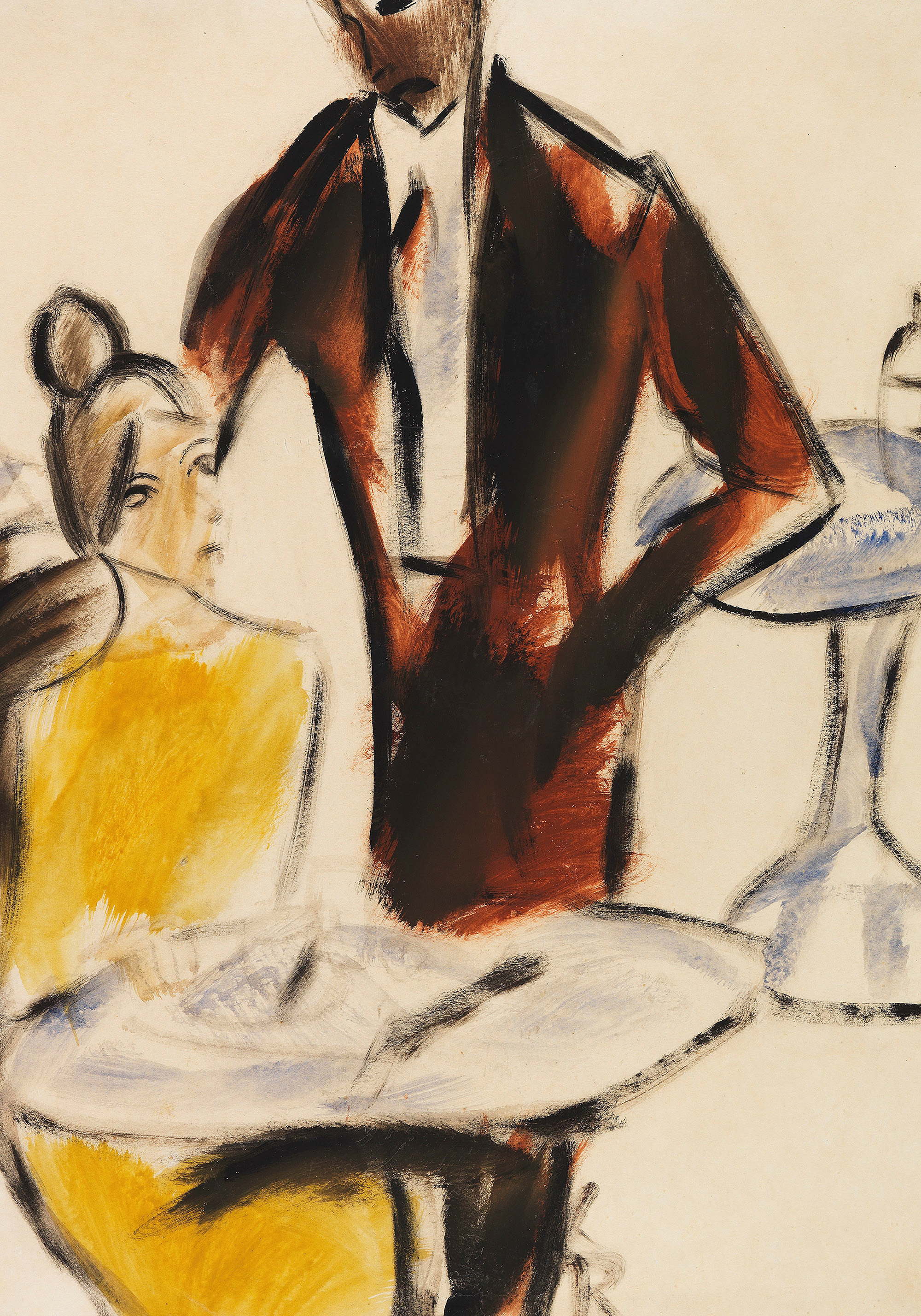 A print of two figures in a café. One person wears a yellow outfit and sits at a table, while the other stands in a dark red jacket. Sketchy art style with bold strokes.