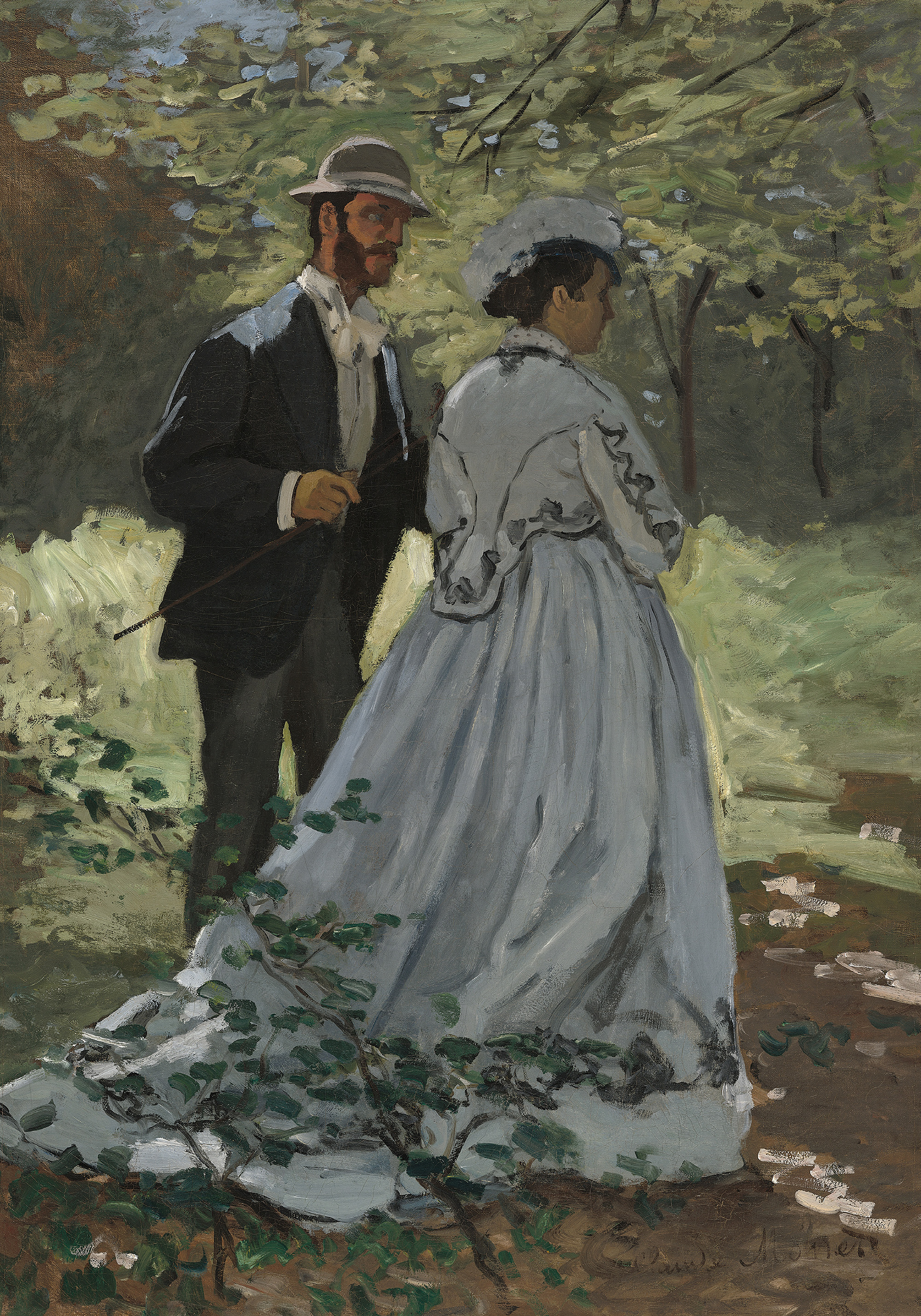 From $15.57A print of a man and a woman standing in a green, leafy garden. The man wears a dark suit and hat, while the woman wears a white dress with black trim. Perfect wall art for your home.