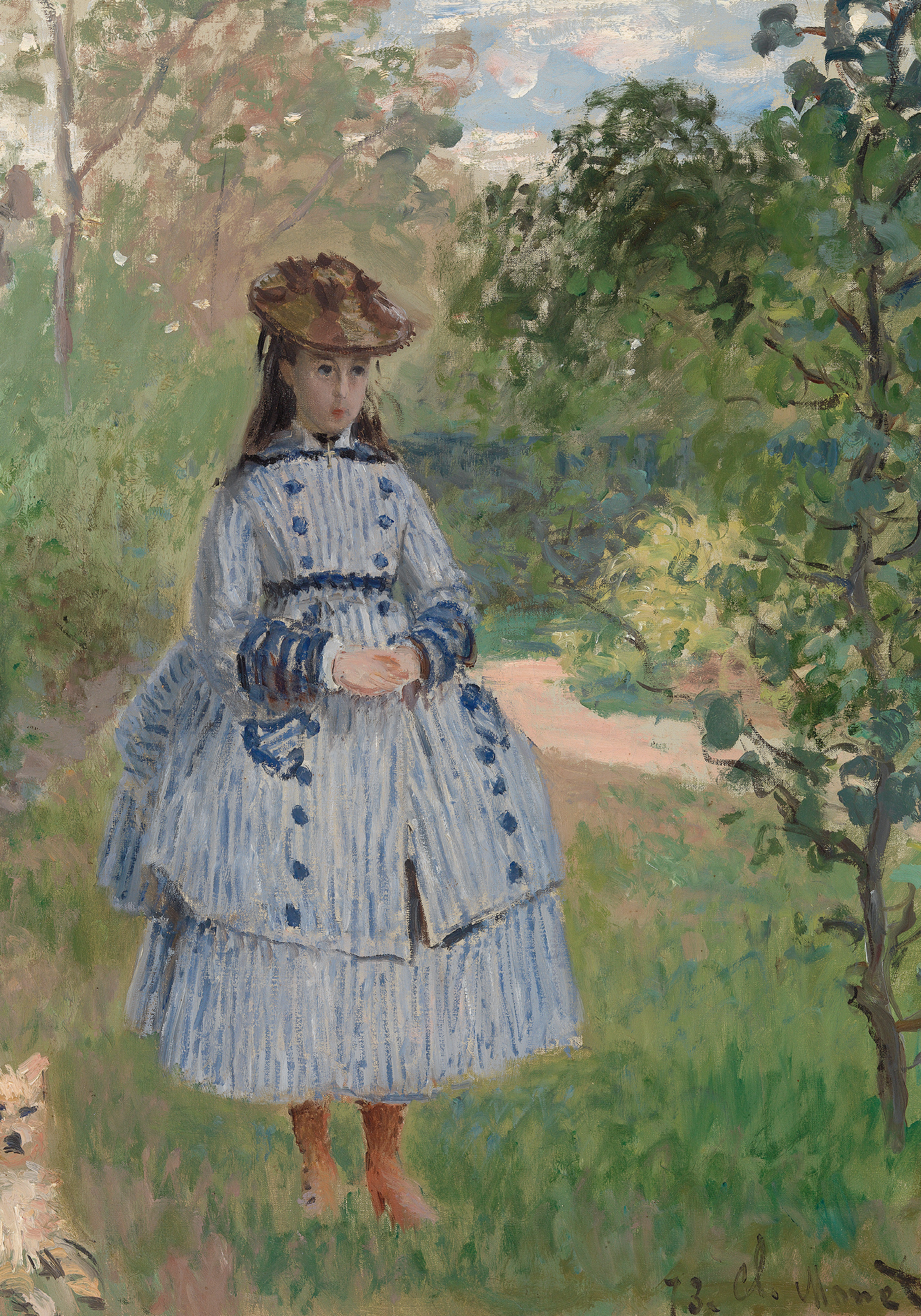 A print of a woman in a blue and white striped dress standing in a garden with a small dog. Beautiful colours of blue and green create a peaceful scene.