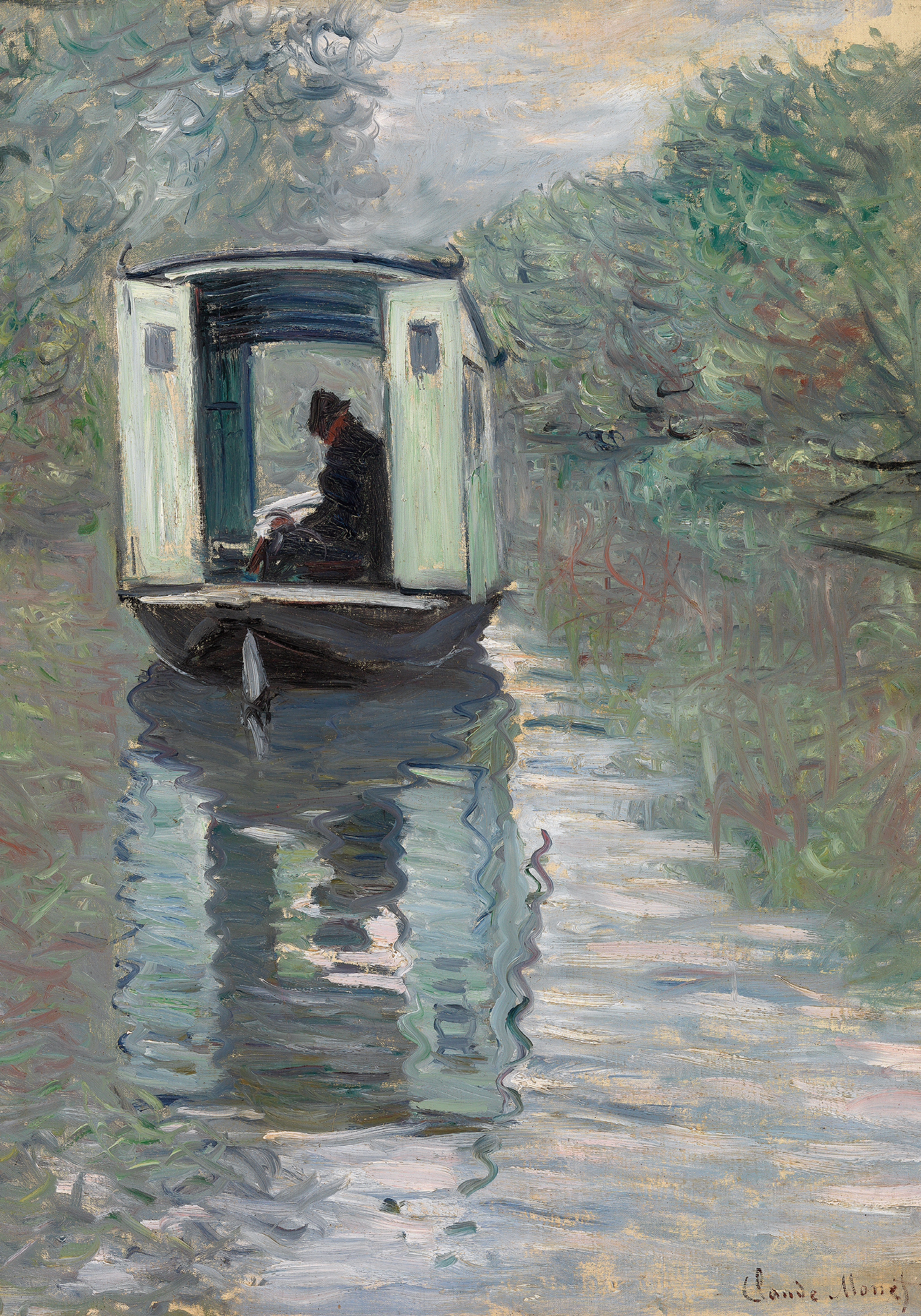 From $15.57A print of a painting by Claude Monet showing a small boat with a light green cabin floating on calm water. A person sits inside the cabin, surrounded by reflections of trees in the water.