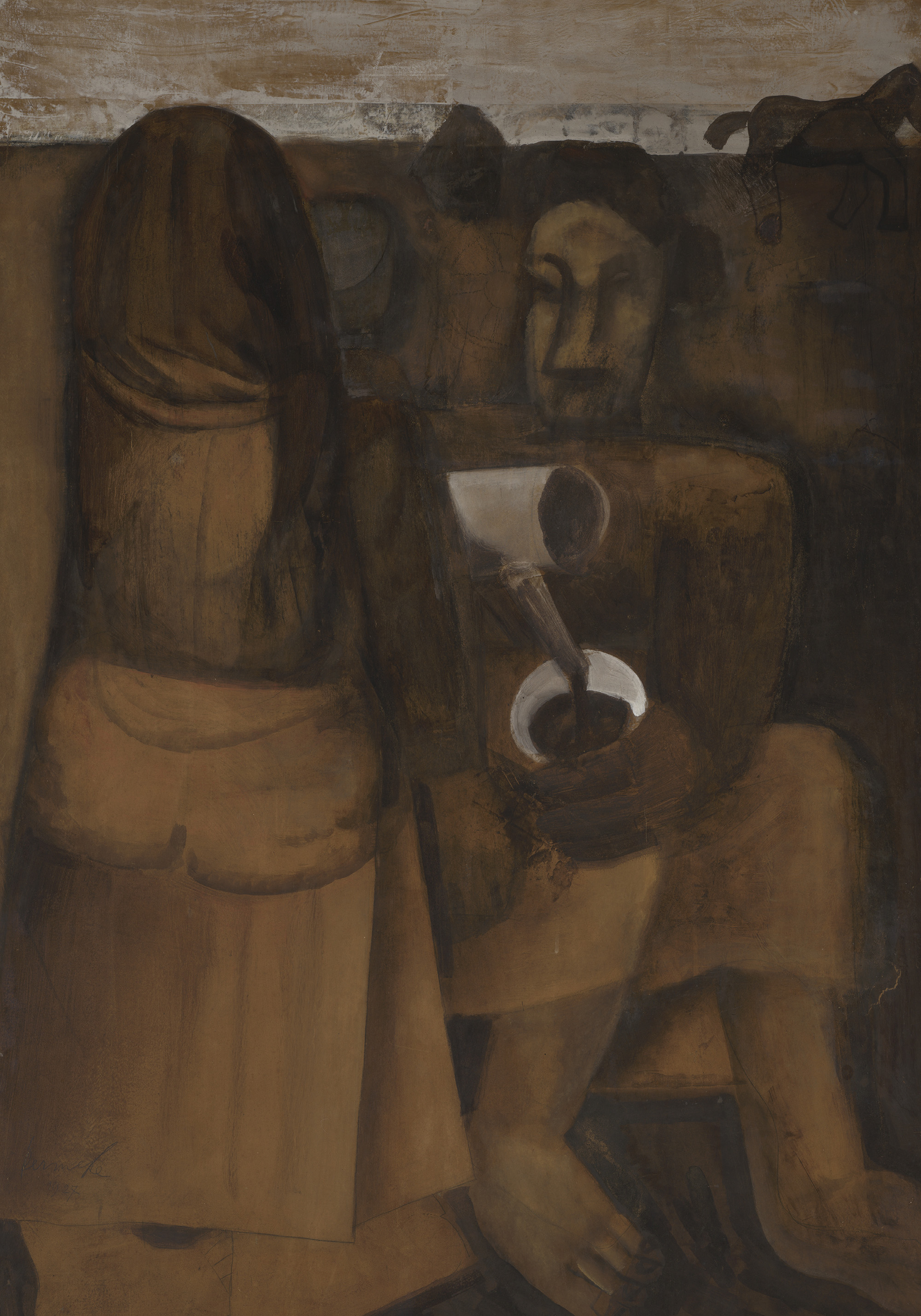 A print showing two abstract figures in brown tones. One figure is seated with a white cup, and the other stands wearing a cloak. Perfect wall art for your home.