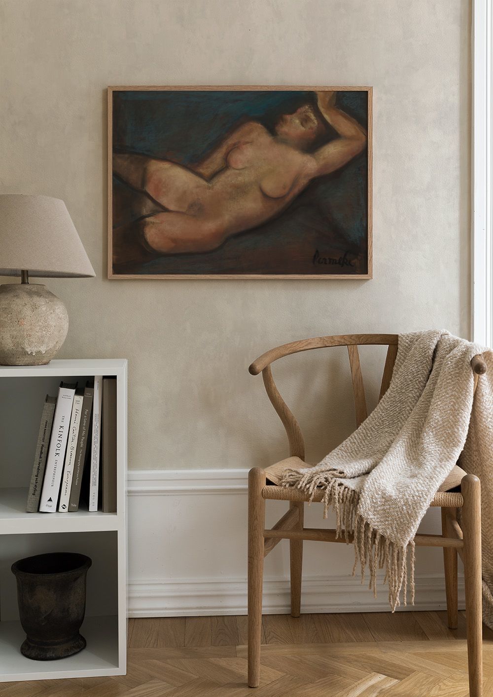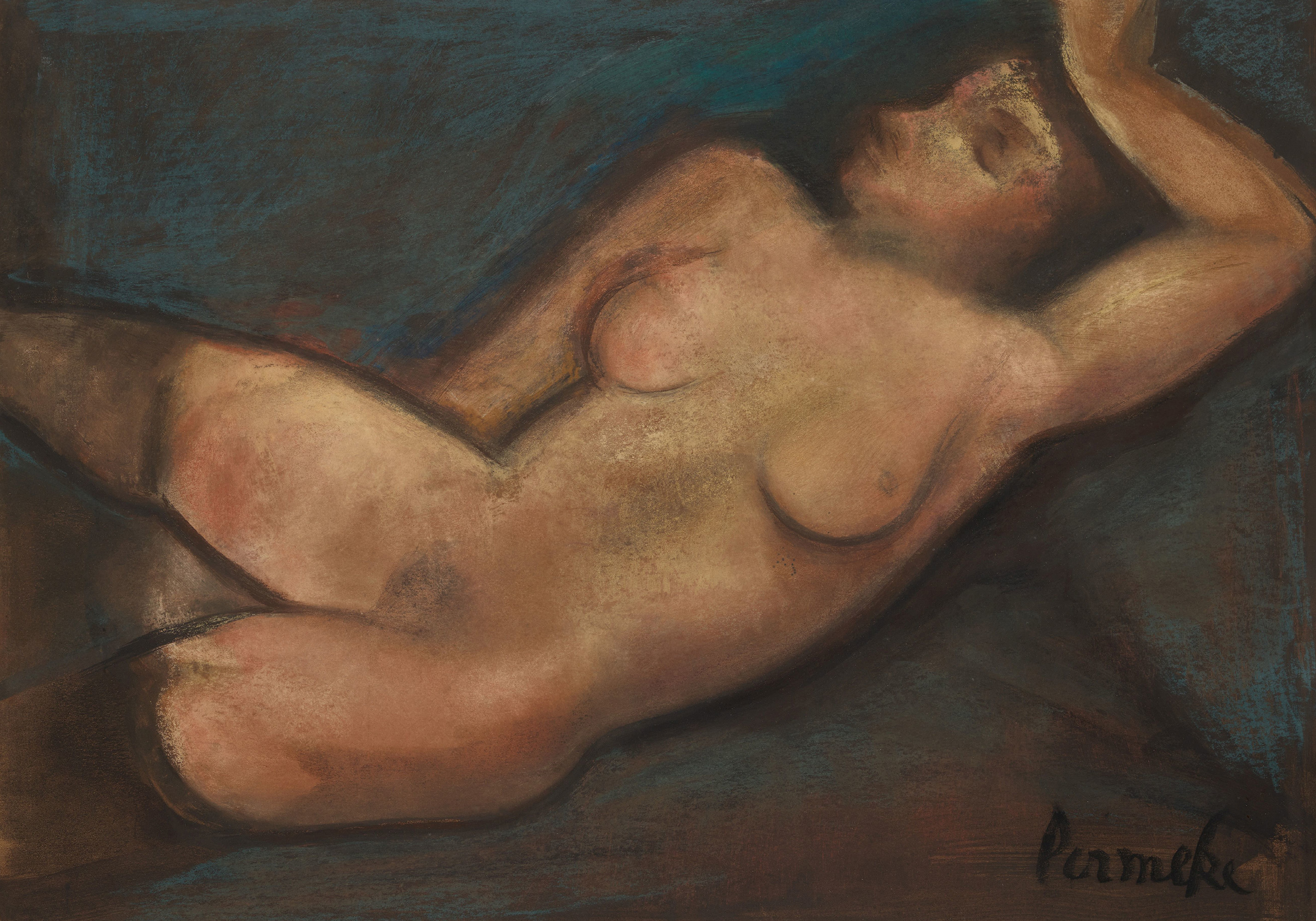 From $15.57A print of a reclining nude figure painted in warm tones of brown, beige, and pink against a deep blue background. The loose brushstrokes create a textured and expressive look.