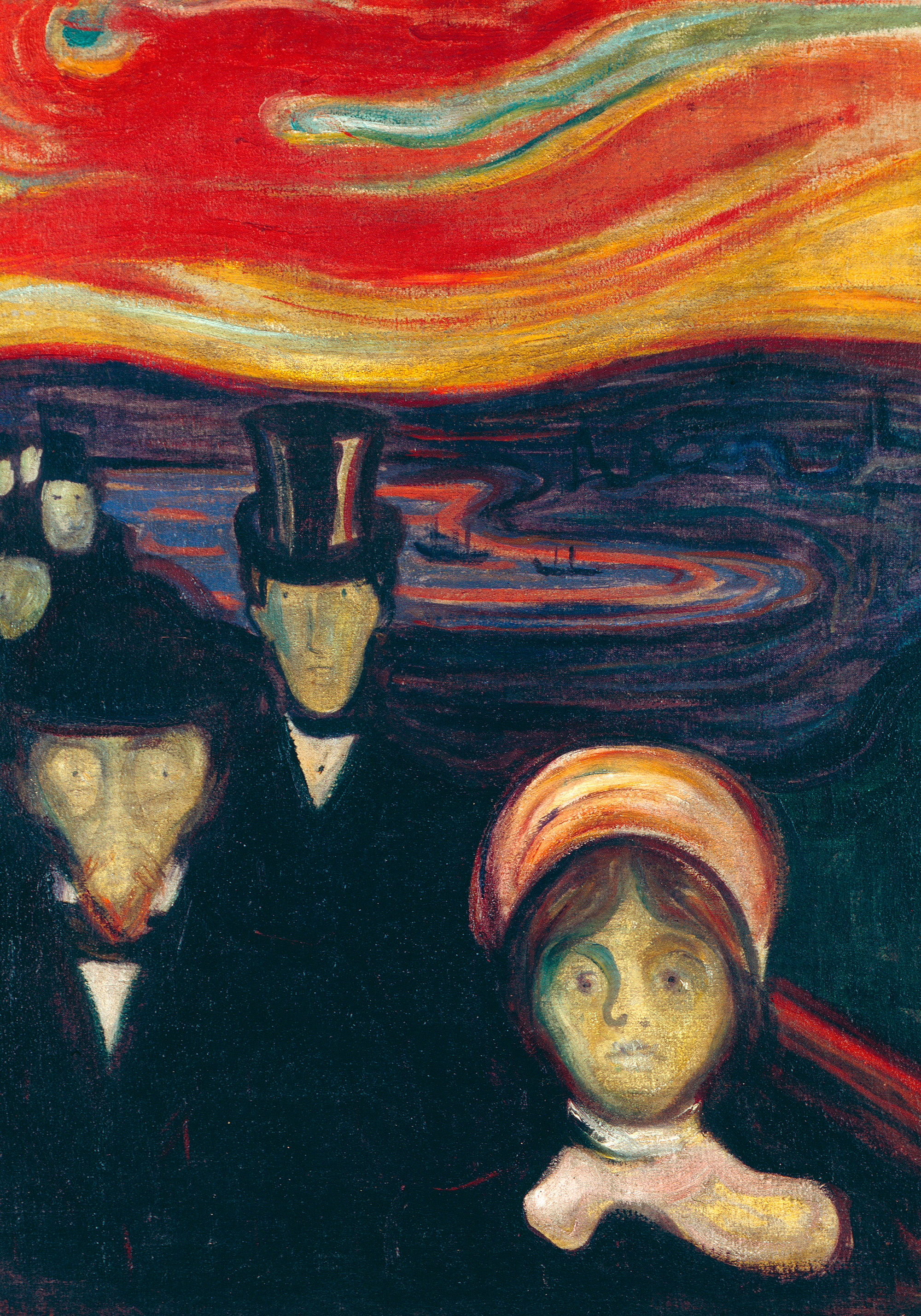 A print showing three people in dark clothes against a swirling sky in red, yellow, and orange. The rough brushstrokes create an intense and mysterious mood.