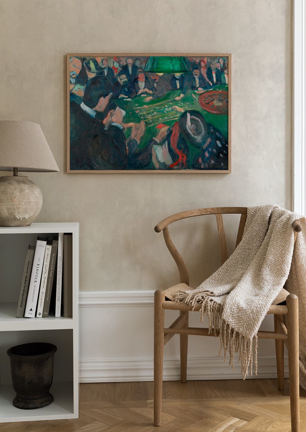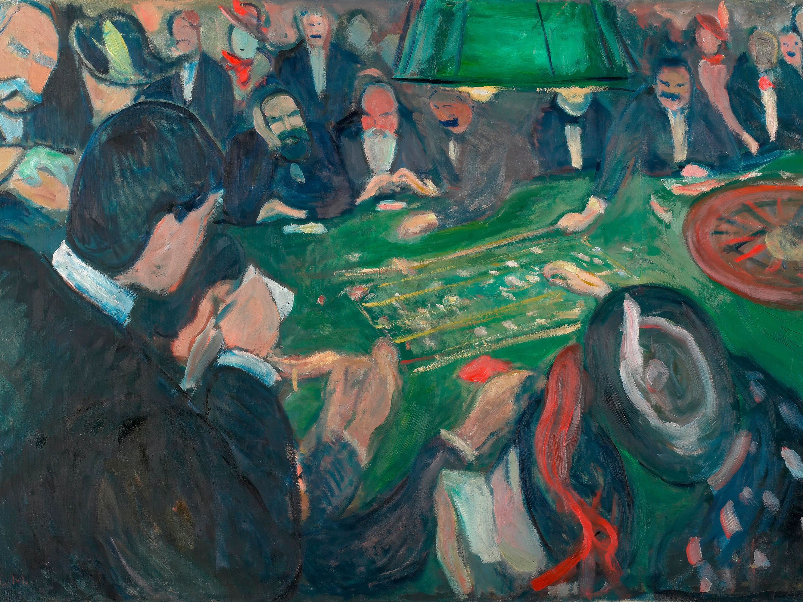 A print of people gathered around a green roulette table in Monte Carlo. The scene shows a lively casino with bold brushstrokes in shades of green, red, and black.