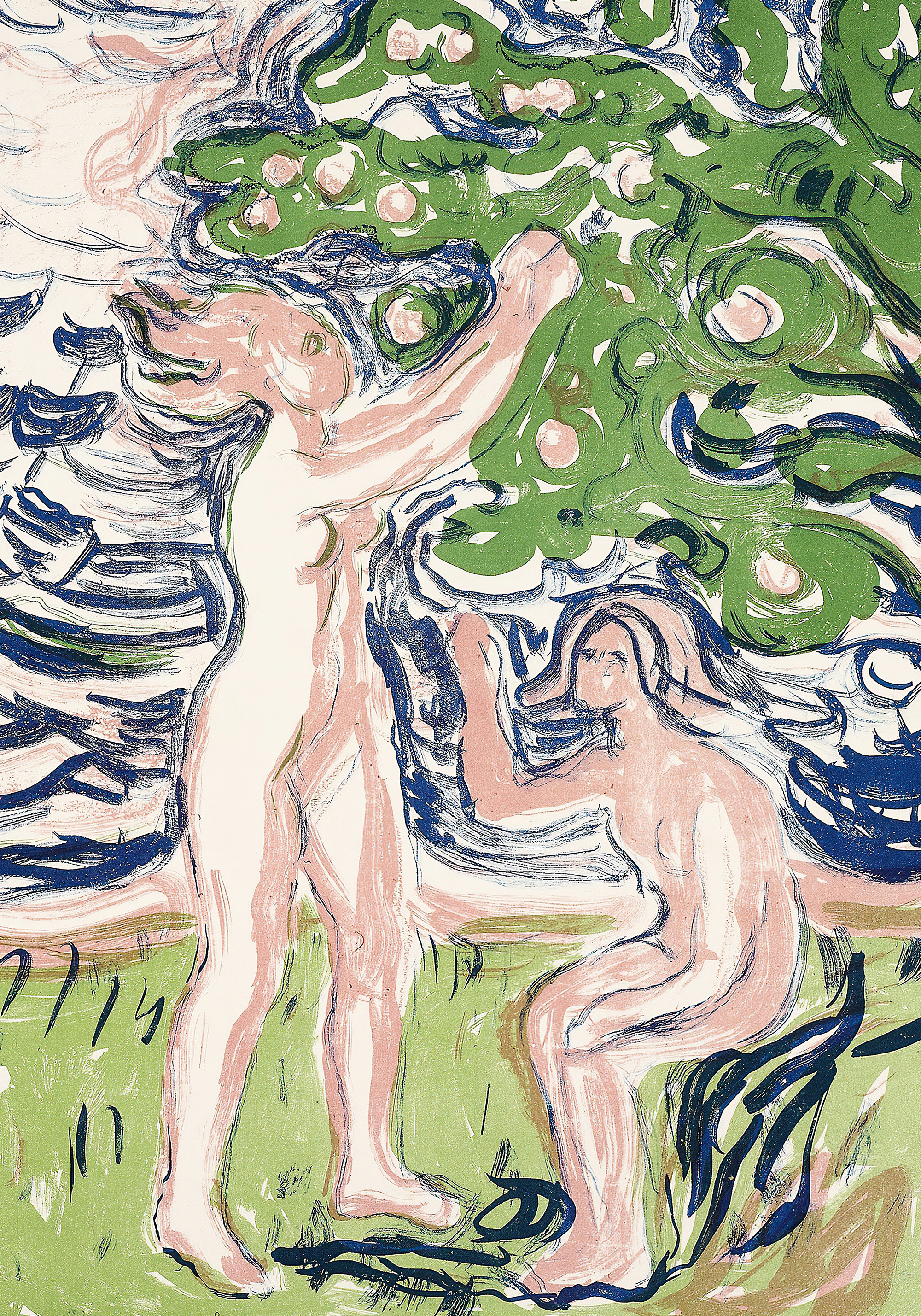 A print illustrating two figures near a tree with round fruits. The art features flowing lines and soft textures in shades of green, blue, and pink.