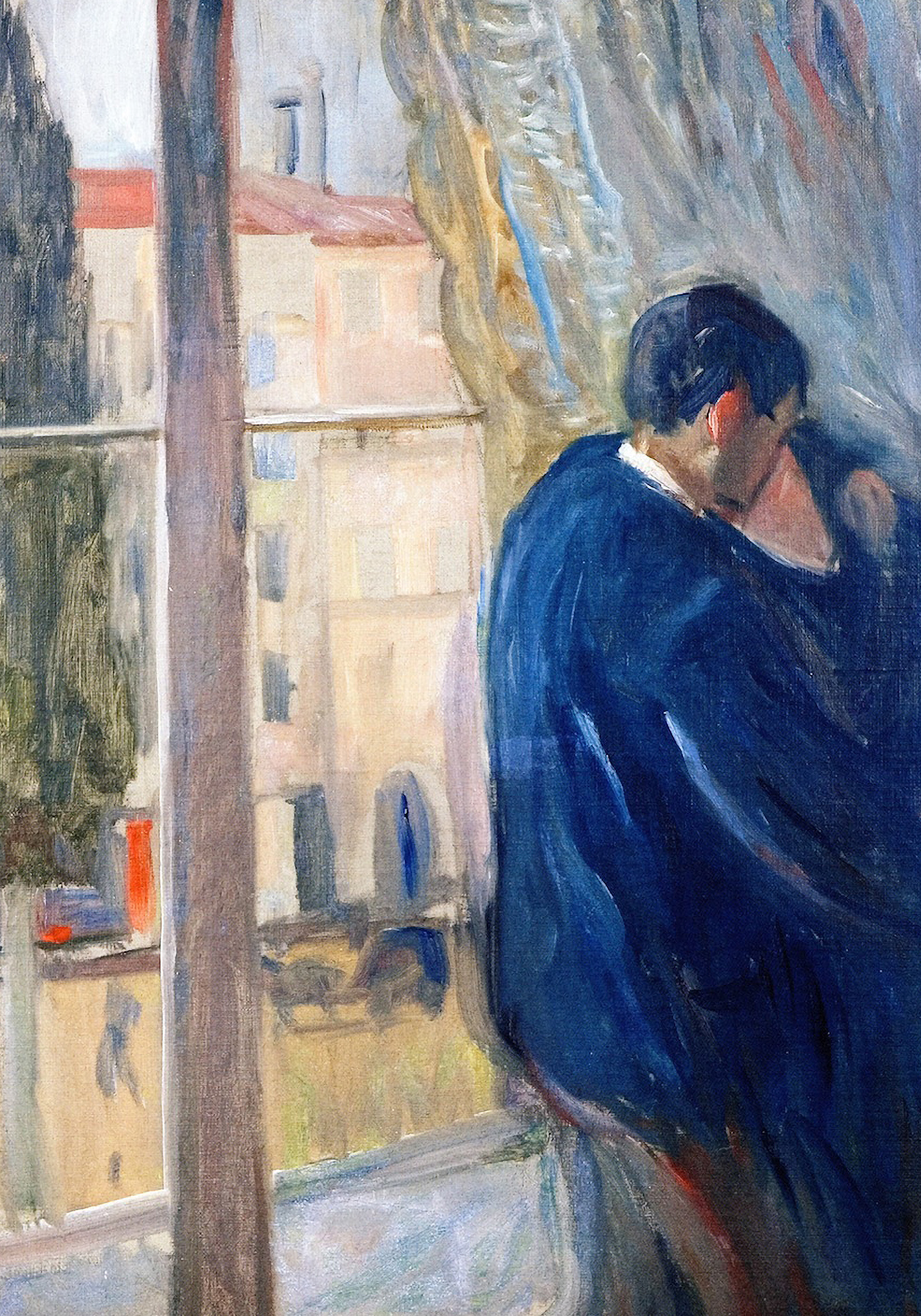 A print of a couple embracing by a window. The man wears a dark blue coat whilst the woman's face is partially hidden. Perfect wall art for your home.