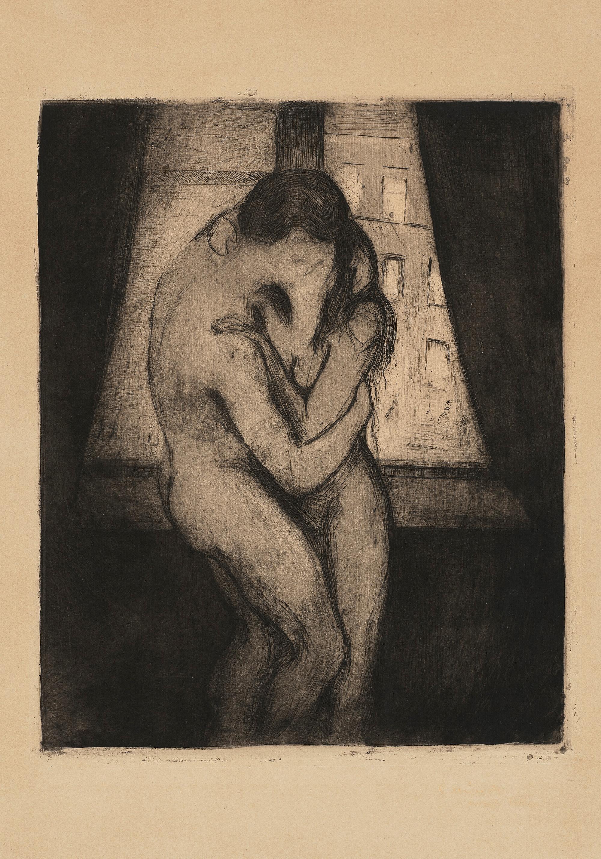 A print illustrating two figures embracing in front of a window. The poster features shades of black and beige with a sketchy, textured style.