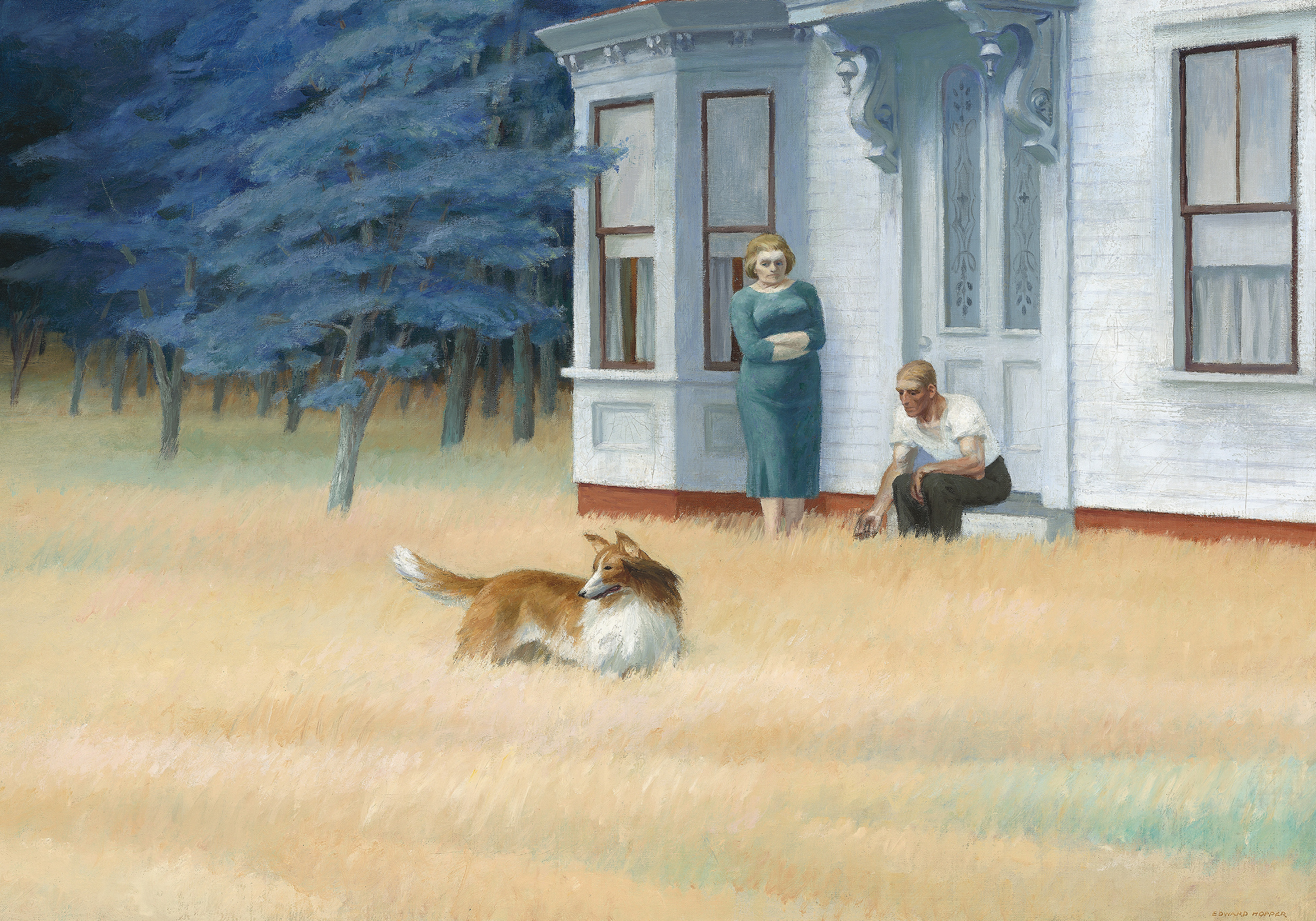 From $15.57A print featuring a white house with a woman in a green dress, a man in a white shirt, and a brown and white dog in yellow grass. Blue trees in the background create a calm scene.