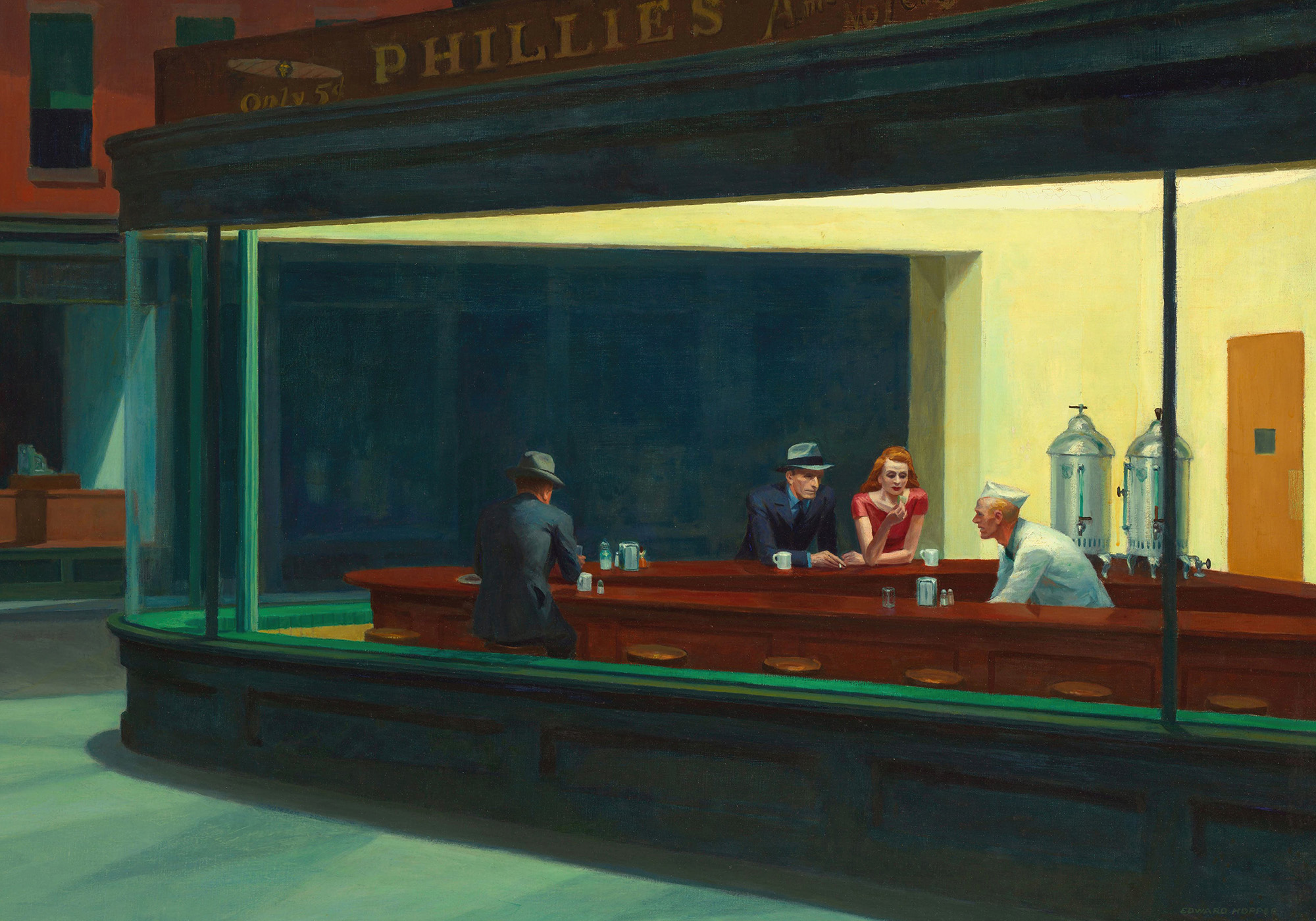 From $15.57A print of Edward Hopper's famous painting "Nighthawks". The artwork shows a diner at night with large glass windows. Inside, people sit at the counter under warm yellow light, while outside is dark and empty.