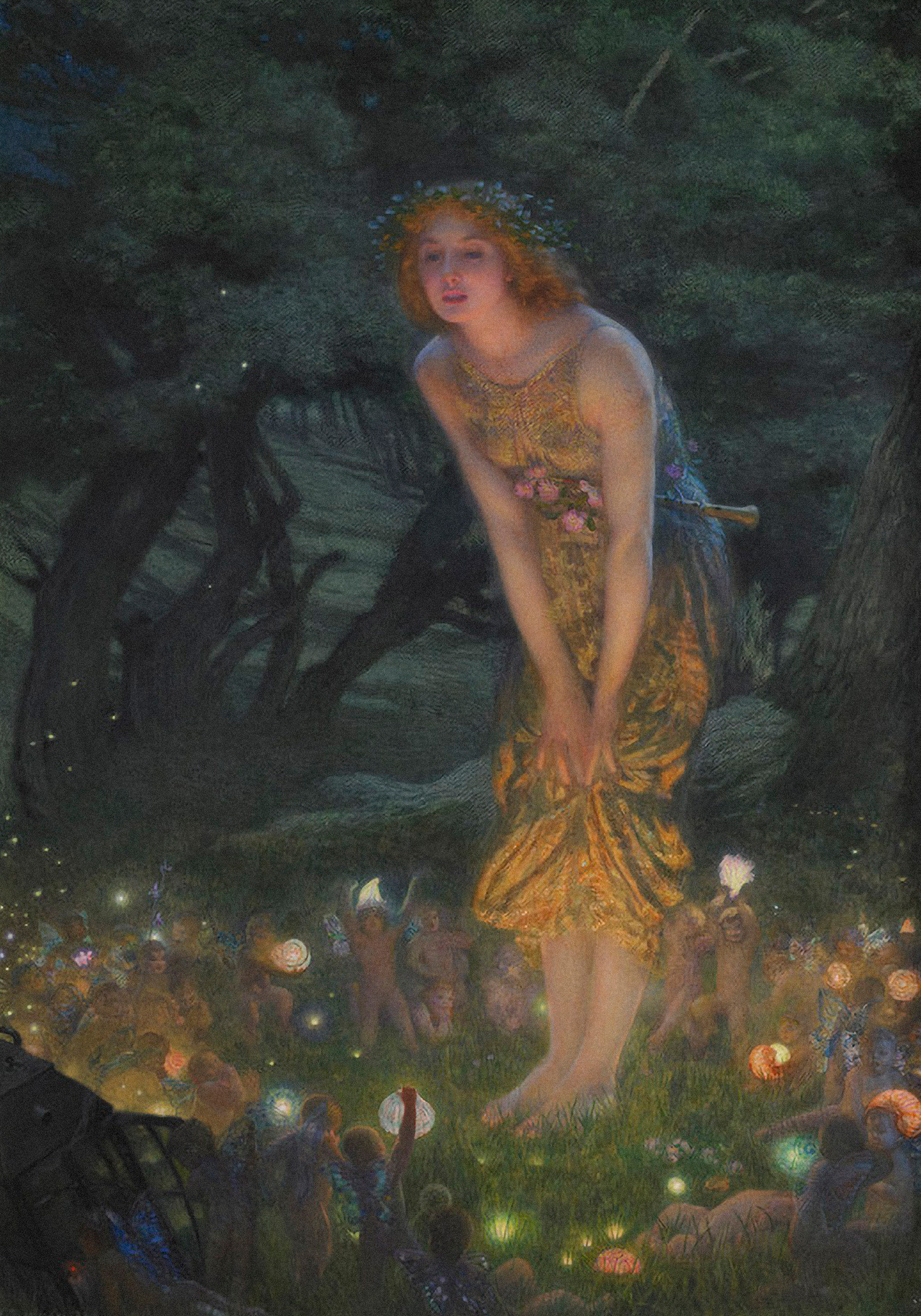 A print of a woman in a gold dress standing in a dark forest. She has red hair and wears a flower crown. Small glowing creatures surround her in this magical scene.