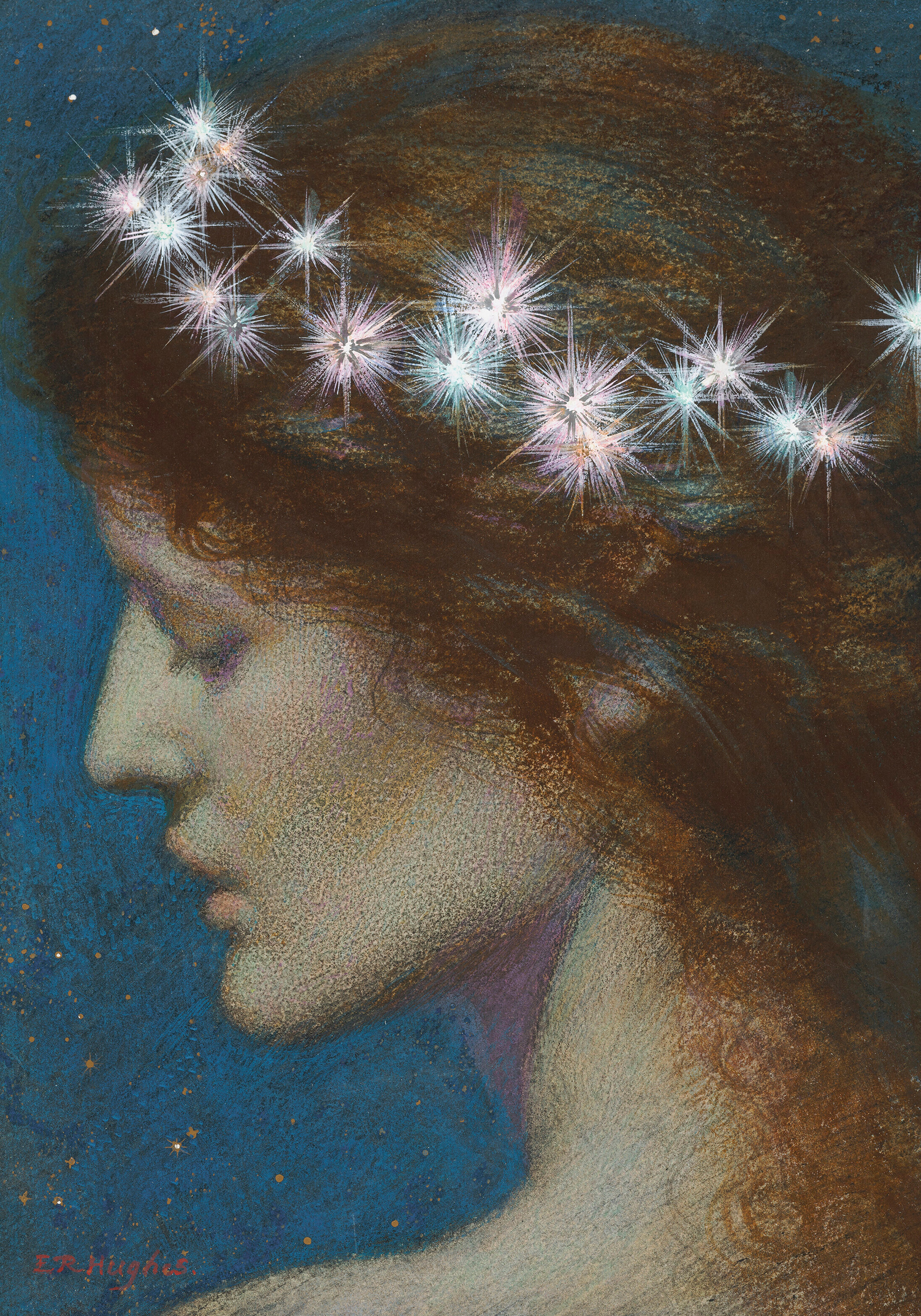 A print of a woman in profile with flowing brown hair and a crown of star-like lights. The background is deep blue with scattered stars, creating a dreamy atmosphere.