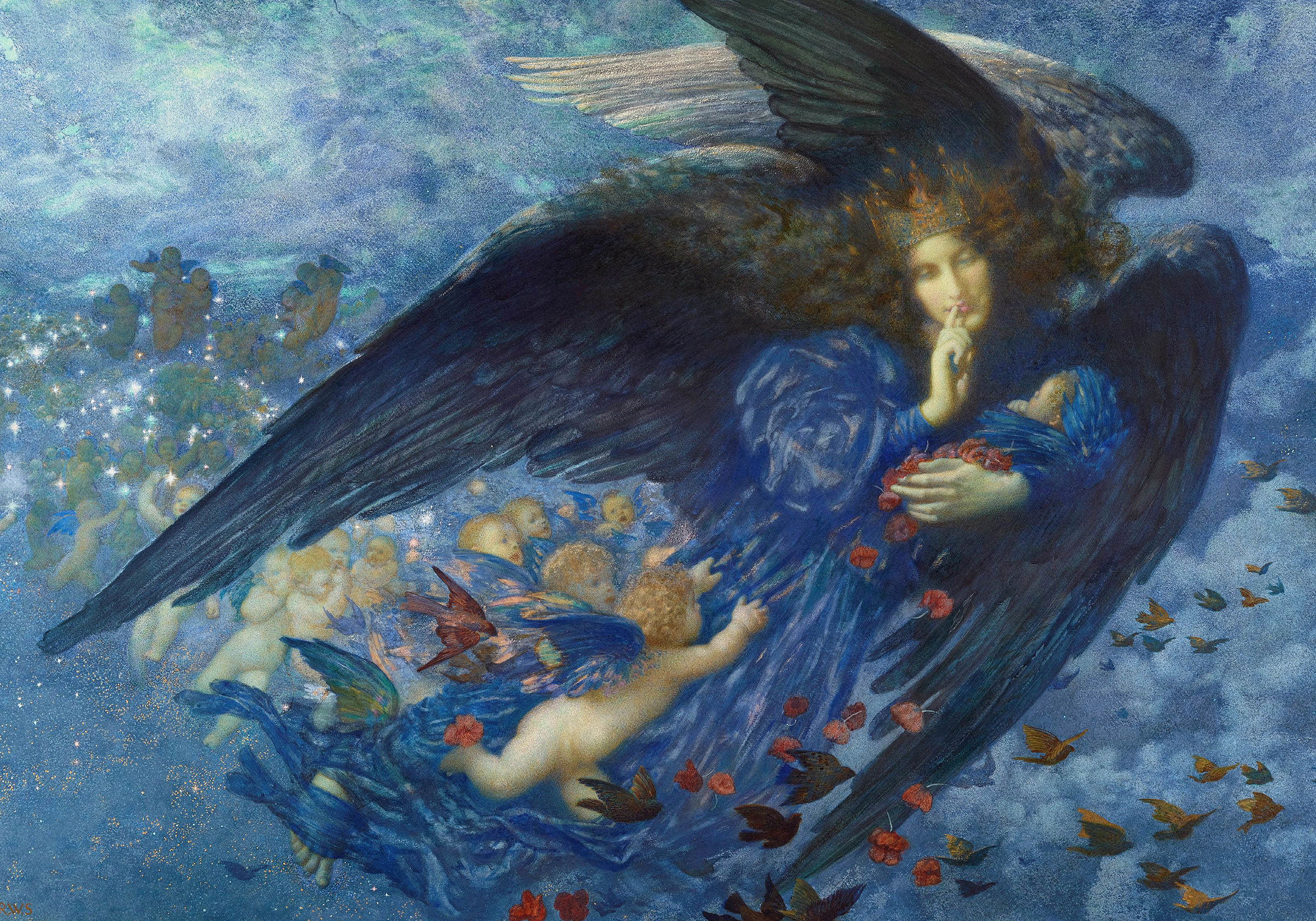From $15.57A print illustrating a celestial figure with dark wings and a crown, holding a baby. The figure is surrounded by small cherubs with blue wings against a starry sky with clouds. Red flowers and birds complete this ethereal scene in shades of blue, gold, red, and brown.