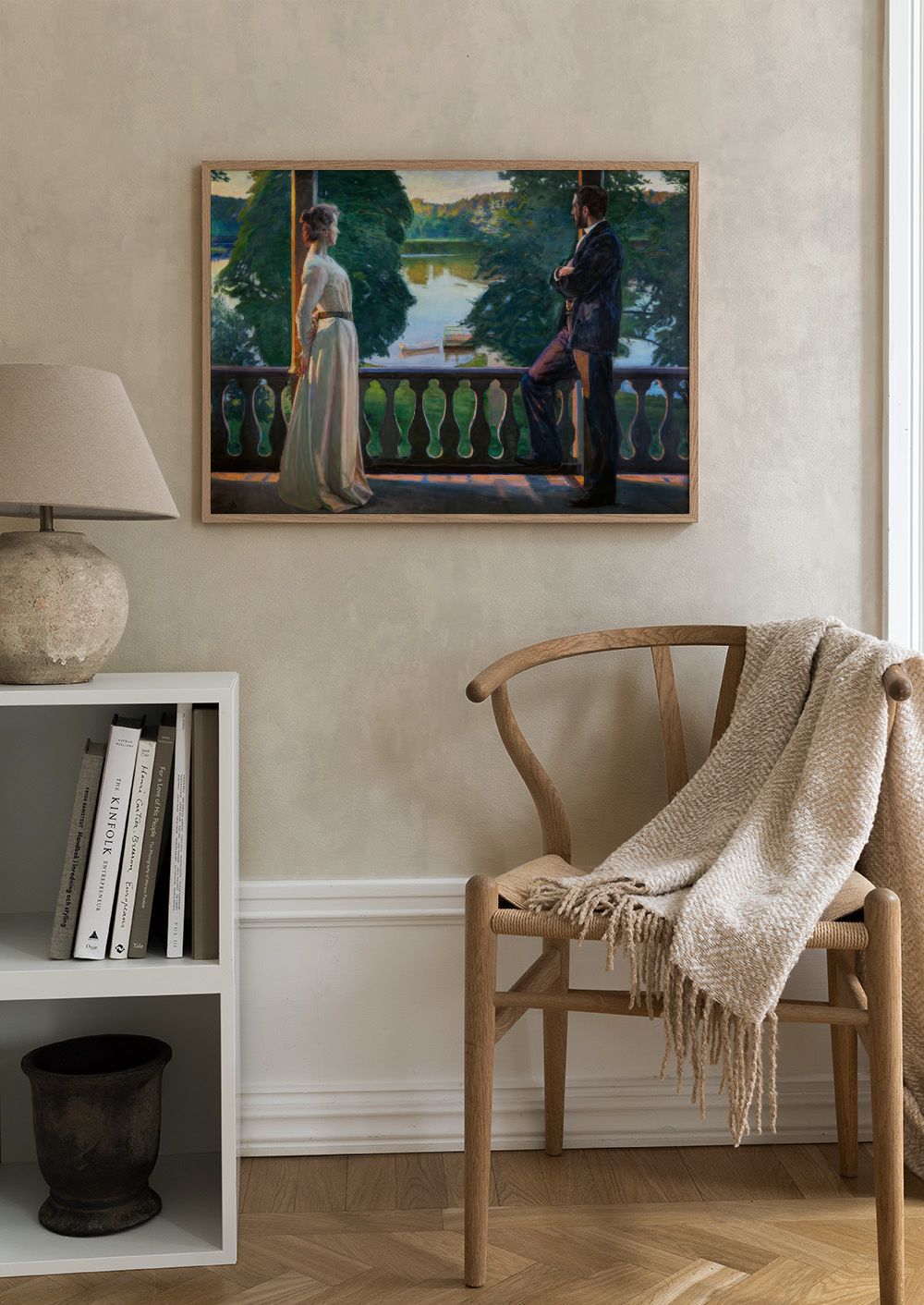 A print of a woman in a white dress and a man in a dark suit standing on a balcony overlooking a peaceful lake surrounded by trees. The warm sky and calm water create a serene atmosphere.