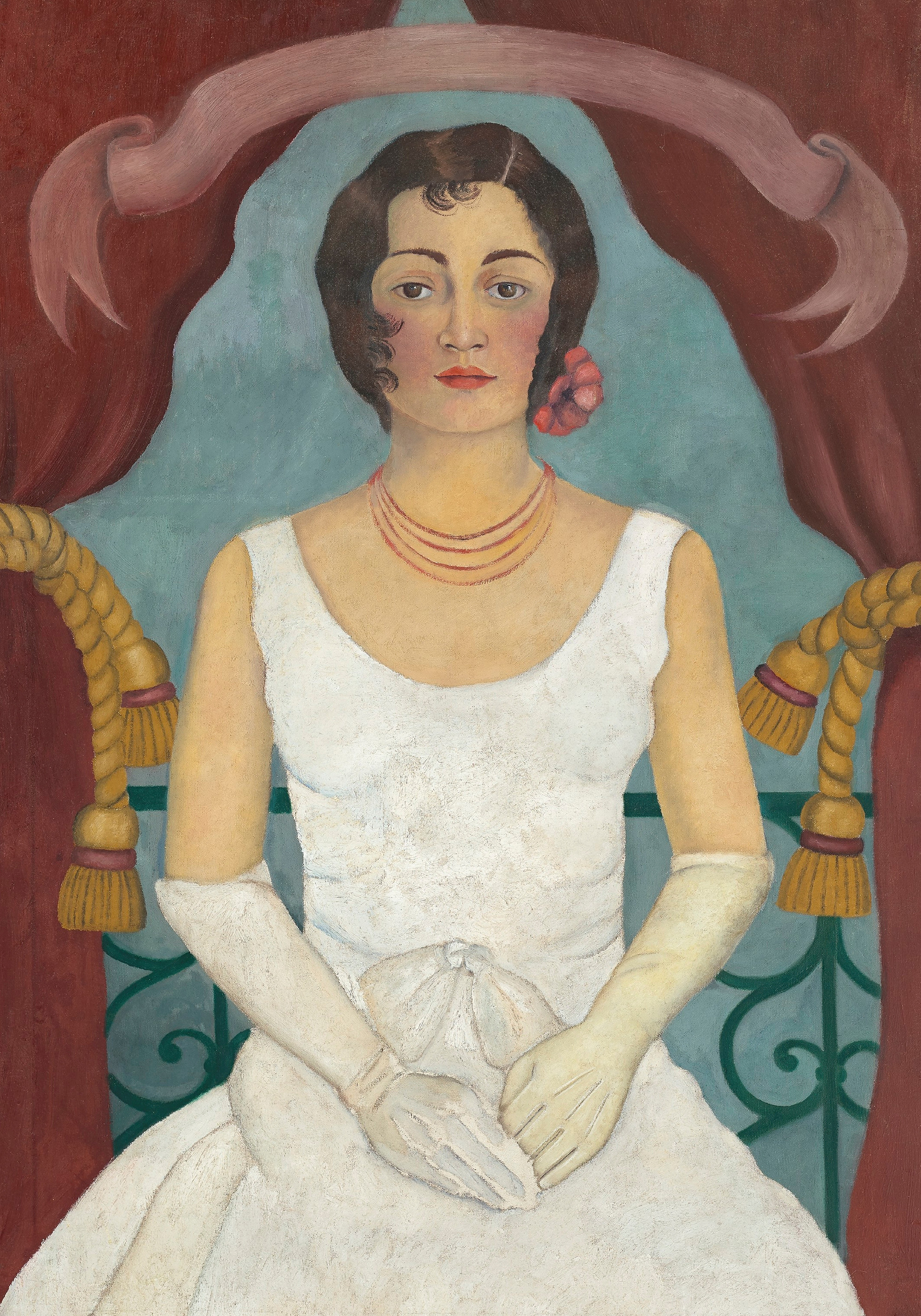 From $15.57A print of a woman in a white dress and gloves sitting in front of a blue background with red curtains. The elegant portrait features red necklaces and yellow tassels on the curtains.