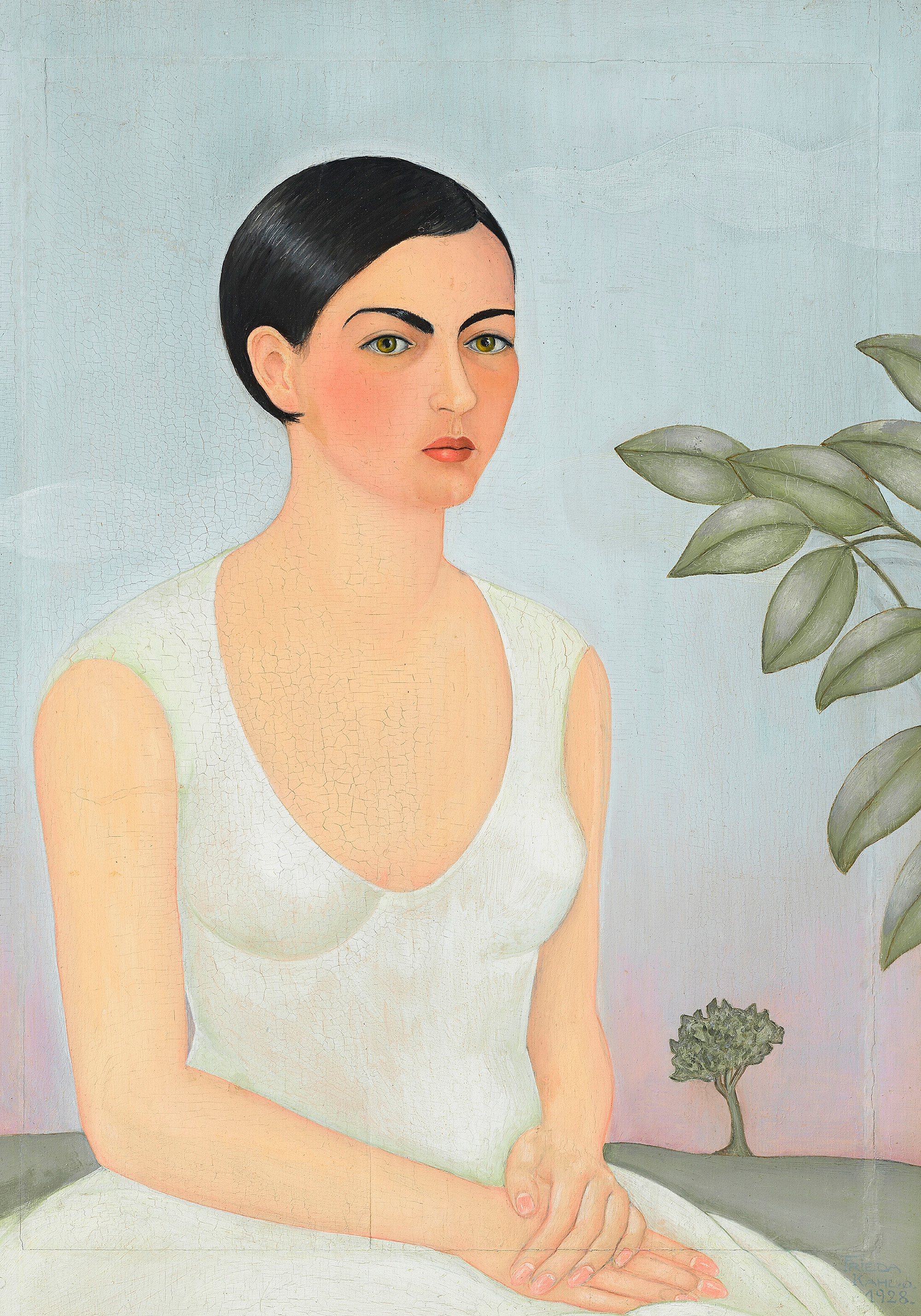 From $15.57A print of a woman with short black hair and green eyes, wearing a white dress. She sits with her hands gently clasped in her lap. Green leaves on a branch are visible to the right, with a light blue background.
