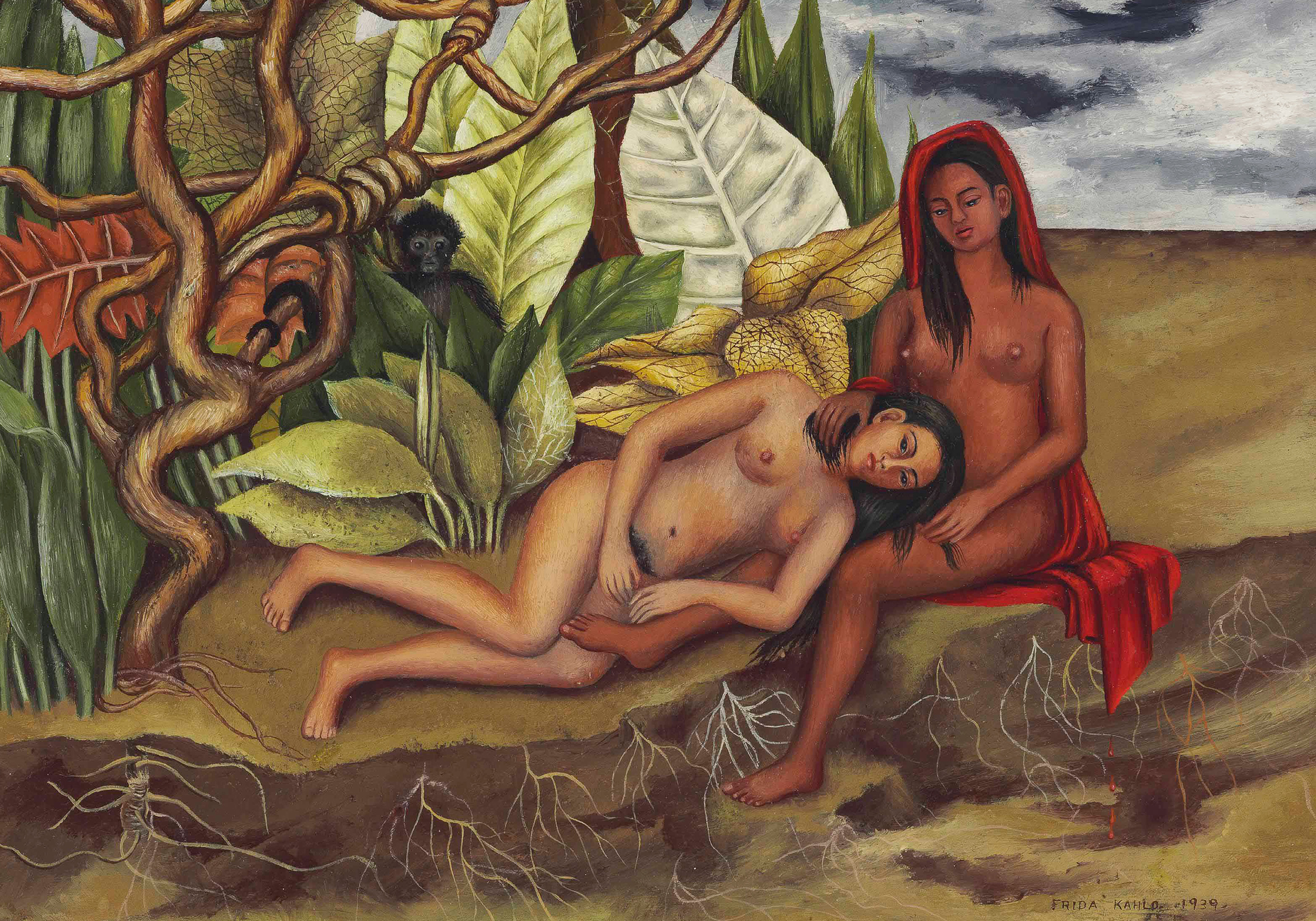 From $15.57A print illustrating two women in a natural setting with green leaves, brown branches, and a small monkey. The print features earthy colours of green, brown, red, and yellow.