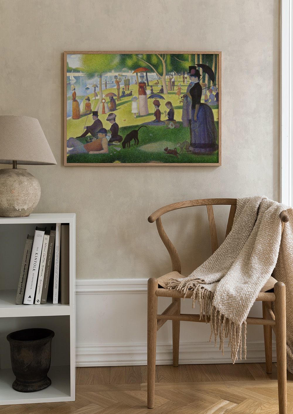 From $15.57A print of people relaxing in a park by the water. The scene shows people wearing hats and holding umbrellas, with trees providing shade. A woman in a long dress and a man in a hat stand nearby, whilst a dog and a monkey rest on the grass. Boats sail on the blue water. The artwork is created with small dots in bright colours.