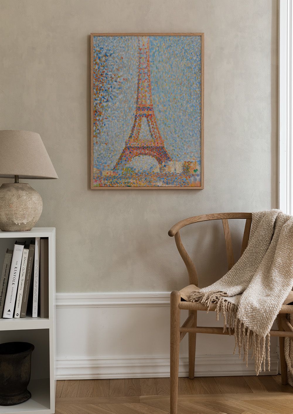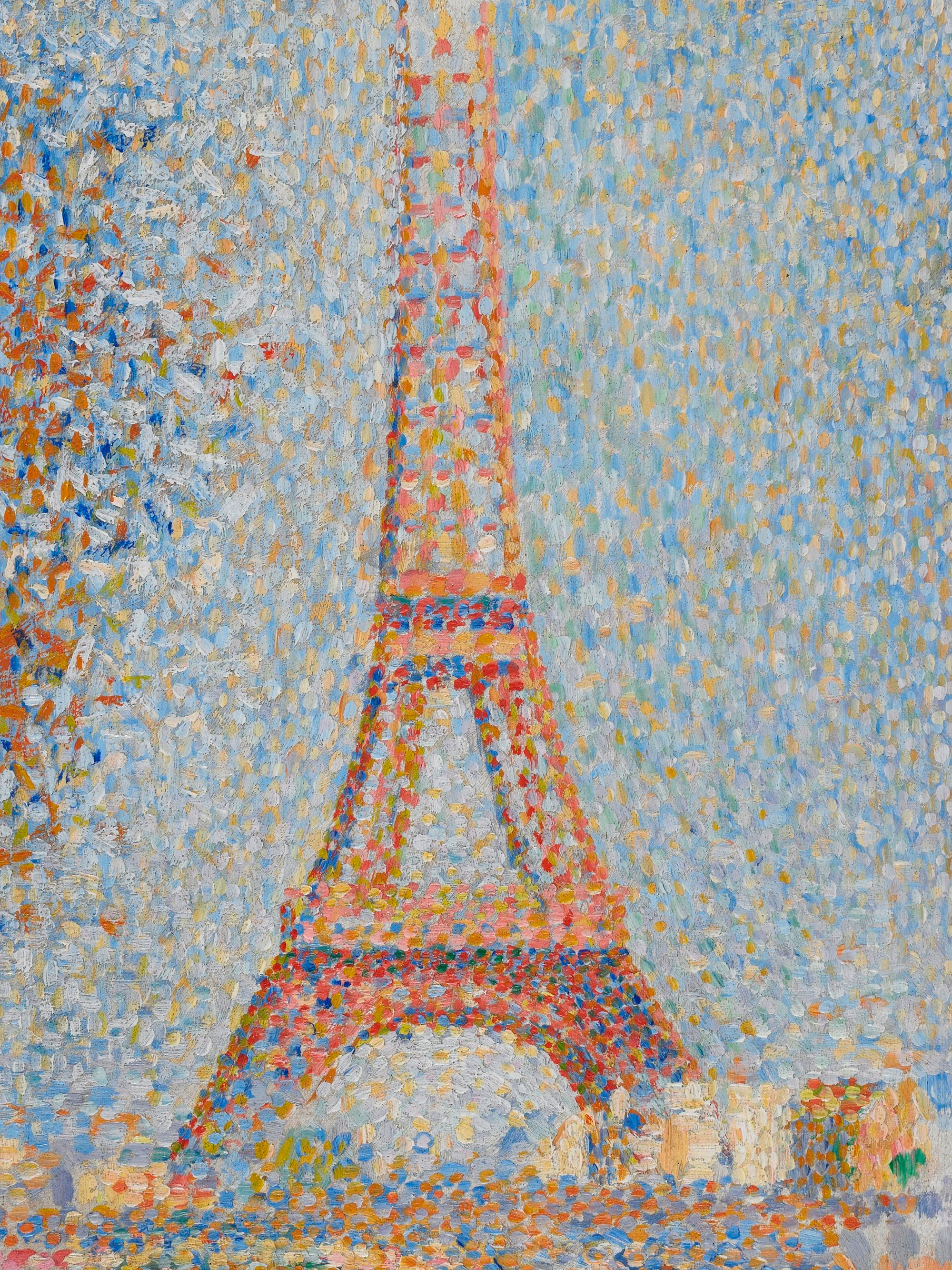A print of the Eiffel Tower in a pointillism style with small dots in orange, yellow, and white against a blue background.
